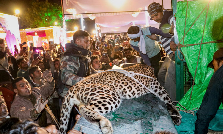 உத்தர பிரதேசத்தின் தலைநகர் லக்னோவில் புத்தேஷ்வர் சாலை பகுதியில் நேற்றிரவு திருமண விருந்து நிகழ்ச்சி ஒன்று நடந்து கொண்டிருந்தது. விருந்தினர்கள் பலர் சாப்பிடுவதற்காக அந்த அறையில் கூடியிருந்தனர். அப்போது, சிறுத்தைப்புலி ஒன்று திடீரென உள்ளே நுழைந்தது.