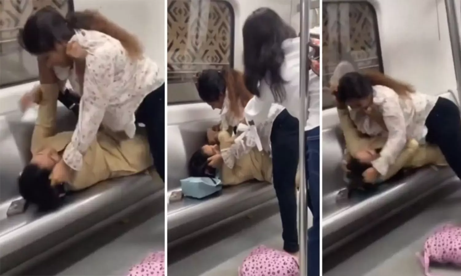 ஒருவர் மற்றவரை மெட்ரோ ரெயில் இருக்கையில் தள்ளிவிட்டு அவரை எழுந்துவிடாமல் இறுக்கிப்பிடித்துக் கொண்டே ஏதோ வாக்குவாதம் செய்கிறார். கீழே இருக்கும் பெண்மணியும் பதிலுக்கு மற்றவரின் தலைமுடியை பிடித்து இழுத்தபடி மோதிக் கொள்கிறார். இன்னொரு பெண் வந்து சண்டையை விலக்கிவிட முயற்சிப்பதும் பதிவாகி உள்ளது.