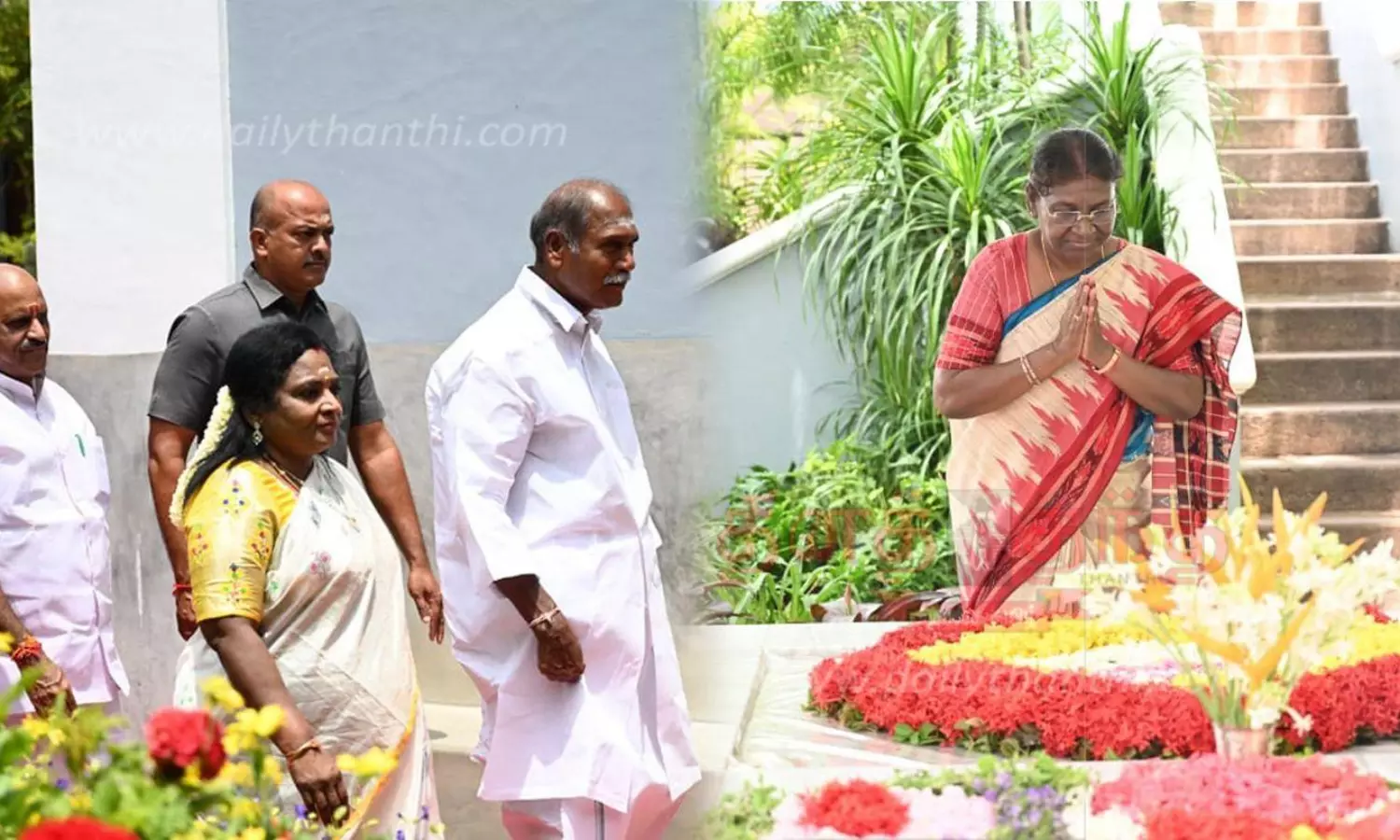 அங்கு மகான் அரவிந்தர், அன்னையின் சமாதியில் திரவுபதி முர்மு, மலர் வளையம் வைத்து மரியாதை செலுத்தினார். பின்னர் அங்கு அமர்ந்து சுமார் 10 நிமிடம் தியானம் செய்தார். தொடர்ந்து அன்னை, அரவிந்தர் ஆகியோர் பயன்படுத்திய அறைகளை பார்வையிட்டார். அப்போது அரவிந்தர், அன்னையின் வரலாற்றை ஆசிரம நிர்வாகிகள் ஜனாதிபதி திரவுபதி முர்முவுக்கு எடுத்துக்கூறினர். பின்னர் மதியம் 12 மணிக்கு அங்கிருந்து புறப்பட்டு ஆரோவில் சென்றார்.