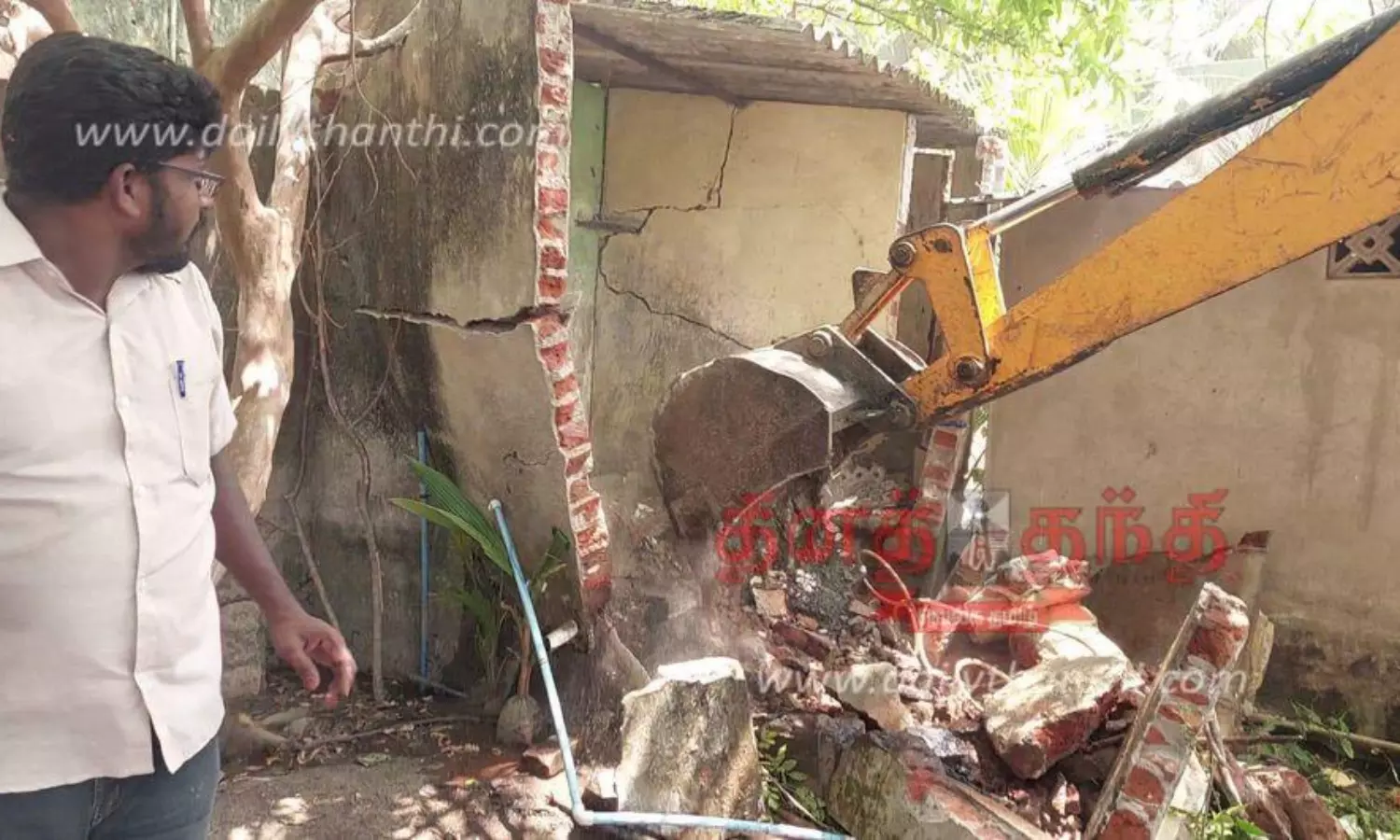 இதையடுத்து அங்கு பொக்லைன் எந்திரம் மற்றும் போலீசாருடன் வந்த கொம்யூன் பஞ்சாயத்து ஆணையர் பாலன், திடீரென்று கழிப்பறை கட்டிடத்தையும், அருகில் இருந்த கொட்டகையையும் இடிக்க முயன்றார்.