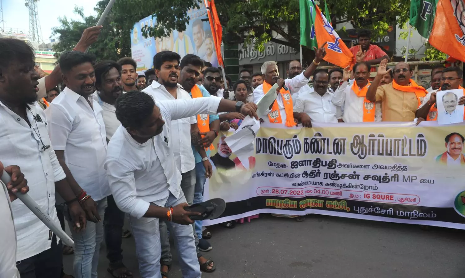 ஜனாதிபதி திரவுபதி முர்முவை தரம்தாழ்த்தி விமர்சனம் செய்த மேற்கு வங்காள மாநில காங்கிரஸ் தலைவர் ஆதிர் ரஞ்சன் சவுத்ரி எம்.பி.யை கண்டித்தும், அவர் மீது சட்டப்படி நடவடிக்கை எடுக்க வேண்டும், அவர் பகிரங்கமாக மன்னிப்பு கேட்க வேண்டும் என்று வலியுறுத்தியும் புதுவை மாநில பா.ஜ.க. சார்பில் இந்திராகாந்தி சிலை அருகில் இன்று ஆர்ப்பாட்டம் நடந்தது.