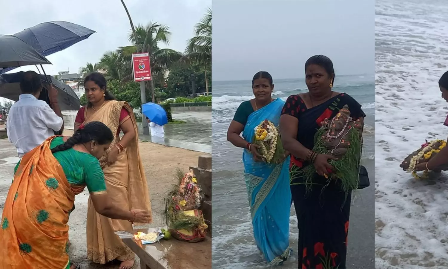 இந்தநிலையில் வீடுகளில் வைத்து வழிபட்ட சிறிய சிலைகளை பொதுமக்கள் கரைத்து வருகின்றனர். குடும்பத்துடன் வரும் பொதுமக்கள் கடற்கரையில் பூஜை செய்து சிலைகளை கடலில் கரைத்து வருகின்றனர்.