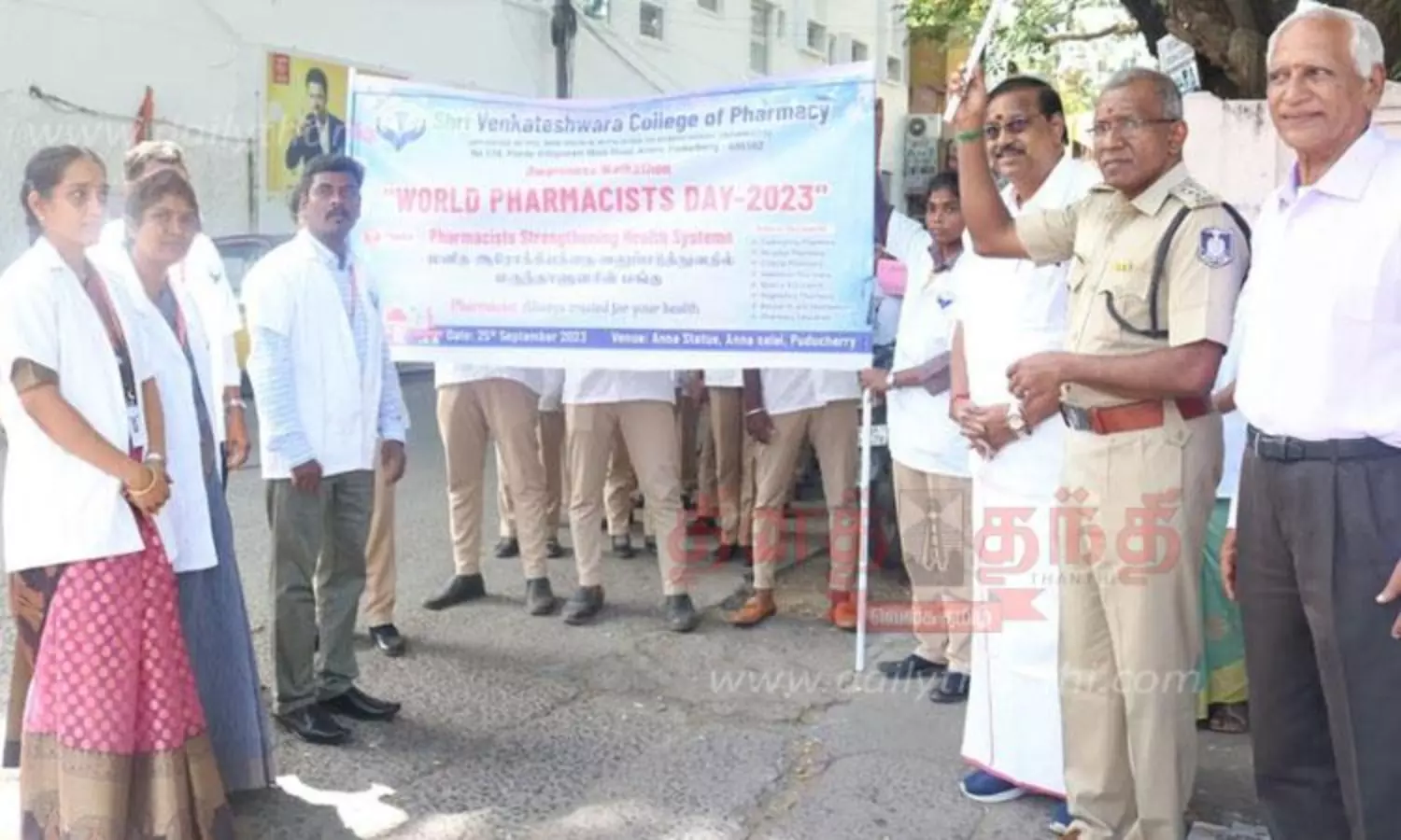புதுவை அரியூர் வெங்கடேஸ்வரா மருந்தியல் கல்லூரி சார்பில் உலக மருந்தாளுனர் தின விழிப்புணர்வு ஊர்வலம் நடைபெற்றது;