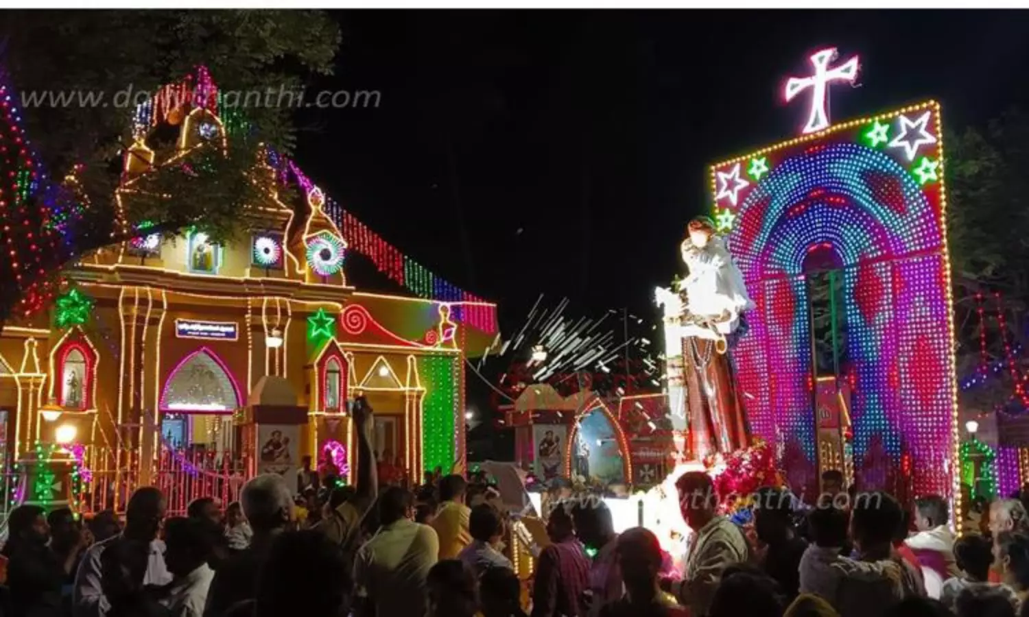விழா நாட்களில் காலை, மாலை நேரத்தில் சிறப்பு திருப்பலி நடைபெற்றது. நேற்று இரவு காரைக்கால் புனித தேற்றரவு அன்னை ஆலய பங்குத்தந்தை பீட்டர் ஹென்றி ஜேசுவா அடிகளார் தலைமையில் சிறப்பு திருப்பலி நடந்தது. அதனை தொடர்ந்து மின்விளக்கு அலங்காரத்தில் பெரிய தேர்பவனி நடைபெற்றது. இதில் திரளான கிறிஸ்தவர்கள் கலந்துகொண்டனர்.