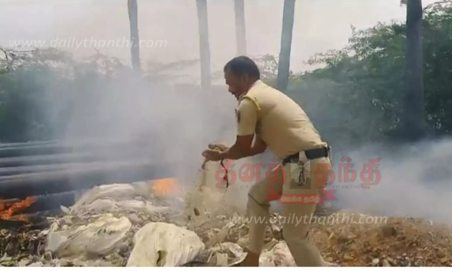 குப்பையில் பற்றி எரிந்த தீயை போராடி அணைத்த போலீஸ்காரர்