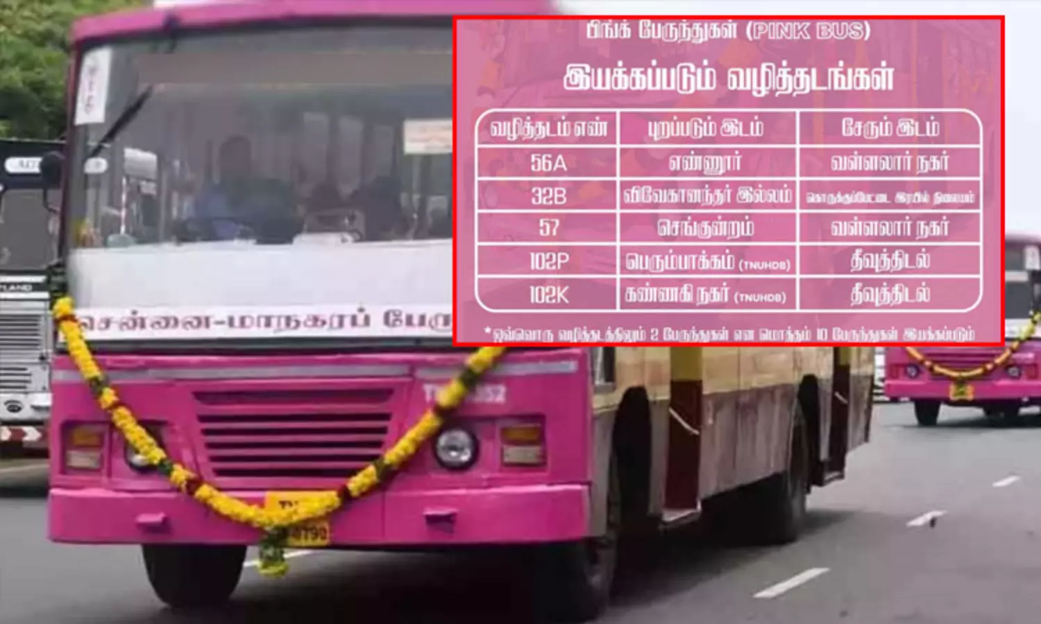 இந்த நிலையில், மகளிர் விடியல் பயண திட்டத்தின் ஒரு பகுதியாக சென்னையில் இன்று புதிதாக தொடங்கப்பட்டுள்ள ‘மகளிர் மட்டும் - PINK BUS’ இயக்கப்படும் வழித்தடங்களின் பட்டியலை சென்னை மாநகர போக்குவரத்து கழகம் வெளியிட்டு உள்ளது. இதன்படி, எண்ணூரில் இருந்து வள்ளலார் நகர் நோக்கி 56ஏ என்ற வழித்தடம் எண் கொண்ட பேருந்து இயக்கப்படும்.