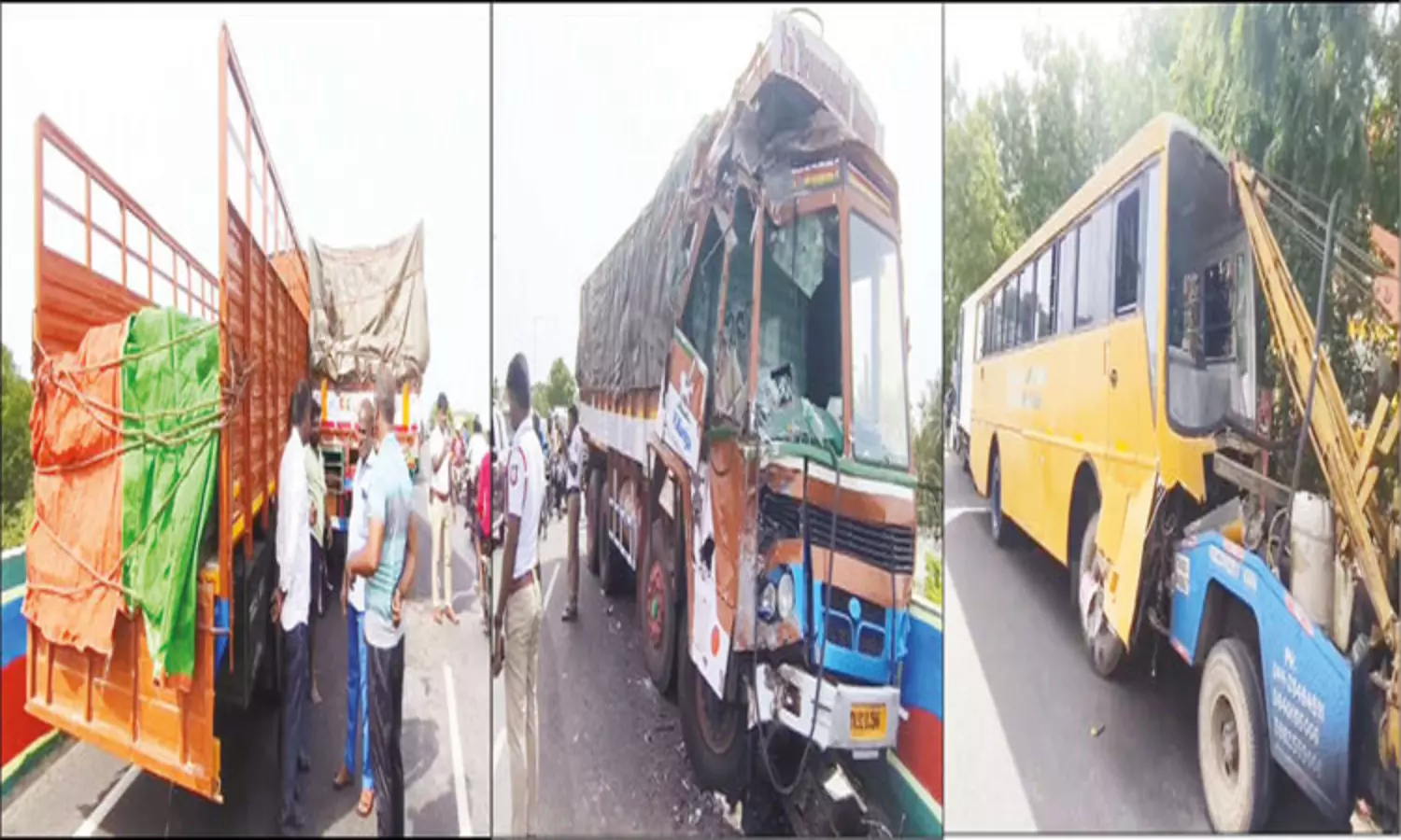 விபத்தில் சிக்கிய தனியார் பாலிடெக்னிக் கல்லூரி பஸ்சை மீட்டுக்கொண்டு மீட்பு வாகனம் ஒன்று பெரம்பலூரில் இருந்து திருச்சி நோக்கி வந்து கொண்டிருந்தது. திருச்சி நம்பர் ஒன் டோல்கேட் அருகே கூத்தூர் மேம்பாலத்தில் வந்தபோது, அதே திசையில் வெல்ல மூட்டைகள் ஏற்றி வந்த லாரி பஸ்சின் பின்னால் மோதியது.