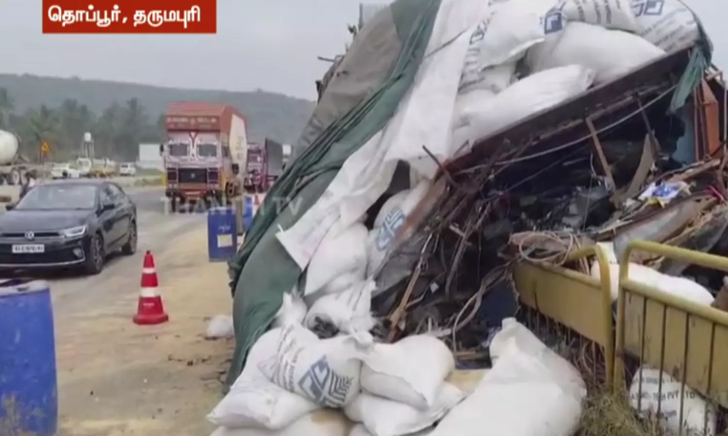 தர்மபரி மாவட்டம் தொப்பூர் அருகே சேலம்- கிருஷ்ணகிரி தேசிய நெடுஞ்சாலையில் சேலம் நோக்கி லாரி ஒன்று சென்றுகொண்டிருந்தது. அப்போது லாரி, திடீரென ஓட்டுநரின் கட்டுப்பாட்டை இழந்து முன்னால் சென்று கொண்டிருந்த பைக், கார் மீது அடுத்தடுத்து மோதி விபத்துக்குள்ளானது. இந்த விபத்தில் 4 பேர் சம்பவ இடத்திலேயே உயிரிழந்தனர்.
