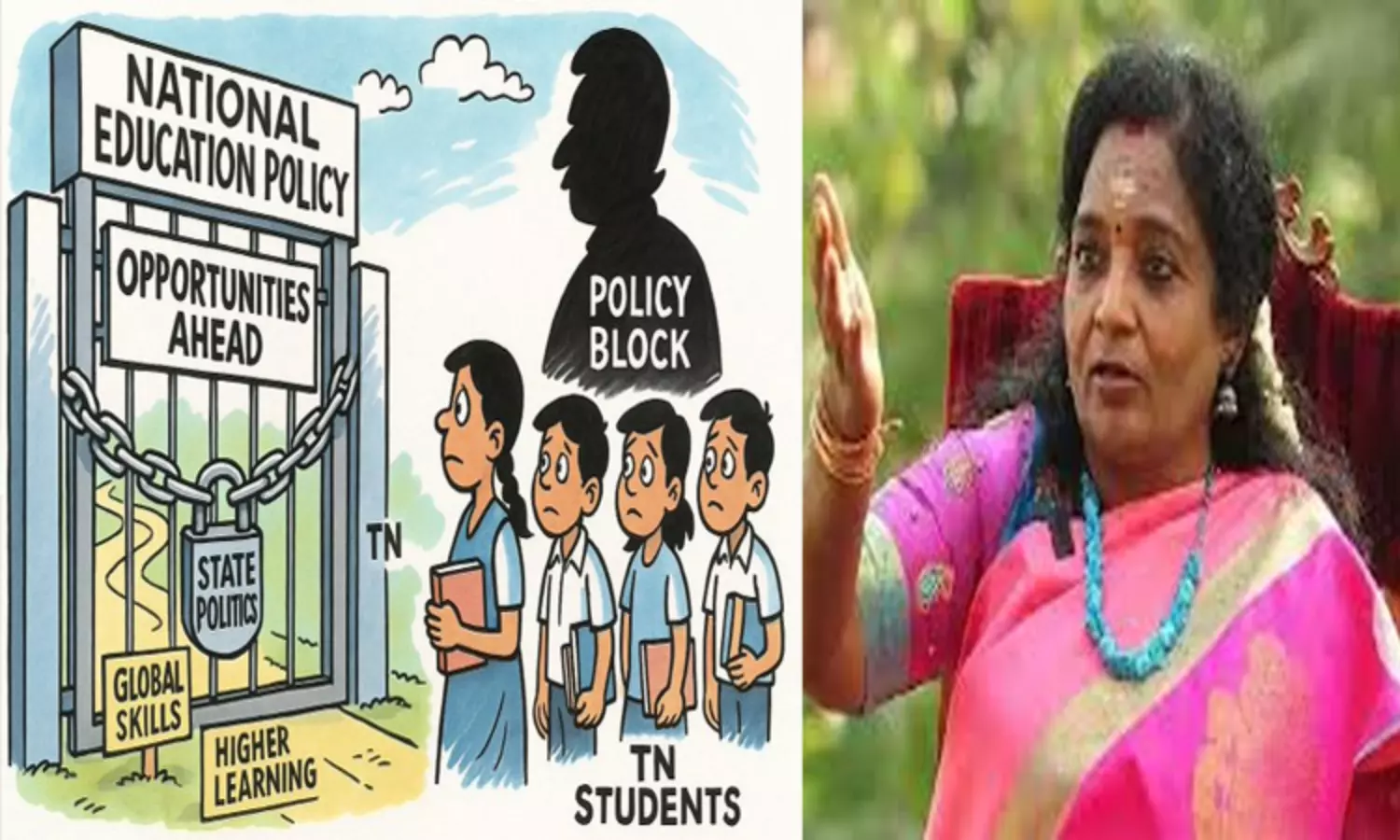 கல்வியில் எந்த புதிய பரிமாணமும் வந்து விடக்கூடாது... நாங்கள் சொல்வதைத்தான் தமிழக மாணவர்கள் படிக்க வேண்டும். அவர்களுக்கு என்று விருப்பு இருந்து விடக்கூடாது.. ஏழை குழந்தைகள் எந்த விதத்திலும் ஏற்றம் பெற விடக்கூடாது என்ற ஆணவப் போக்கில் வெளியிடப்பட்ட புத்தகம். மனவேதனையுடன் சொல்கிறேன்.. இரண்டு மாநில ஆளுநராக பிற மாநிலத்தின் கல்வித் திட்டத்தை பார்த்து விட்டு தான் சொல்கிறேன்...நேற்று 10ம் வகுப்பு தேர்வுகள் முடிவுகள் வெளியே வரும்போது சொல்லப்பட்டது மற்ற மாநிலங்களை விட தமிழகம் சிறப்பாக இருக்கிறது என்று தமிழக மாணவர்கள் சிறப்பாக இருக்கிறார்களே தவிர தமிழக அரசு தமிழை முன்னிறுத்தவில்லை. இதைச் சொன்னால் உடனே என்னை விமர்சிப்பார்கள் இன்று கல்வியை மாநில பட்டியலுக்கு கொண்டு வருகிறோம் என்கிறார். முதல்வர் மத்தியில் ஆட்சியில் இருக்கும் போது ஏன் கொண்டு வரவில்லை? தமிழகத்தில் தான் ஏழைக் குழந்தைகளுக்கு ஒரு கல்வி செல்வந்தர் வீட்டு குழந்தைகளுக்கு ஒரு கல்வி என்ற வேறுபாடு அதிகமாக இருக்கிறது. இந்தப் பாகுபாடை தீர்க்க வந்ததுதான் புதிய கல்விக் கொள்கை ஆனால் புதிய மாற்றம் தமிழகத்தில் வந்து விடக்கூடாது என்பதற்காக வெளியிடப்பட்டதே இந்த மத யானை என்பதே என் மன வேதனை.