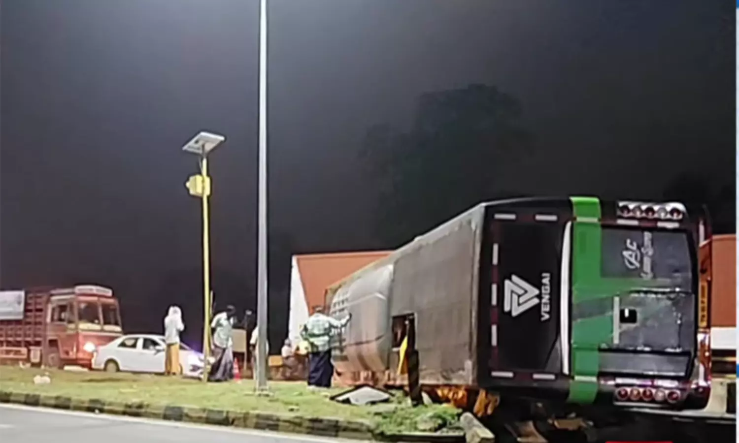 நள்ளிரவு நேரம் என்பதால், பஸ்சுக்குள் தூங்கிக் கொண்டிருந்த பயணிகள் திடுக்கிட்டு எழுந்தனர். படுகாயங்களுடன் பயணிகள் அபயக்குரல் எழுப்பிய நிலையில், அந்த வழியாக வந்த வாகன ஓட்டிகள் போலீசாருக்கு தகவல் தெரிவித்தனர். விரைந்து வந்த போலீசார் மீட்புப் பணிகளில் ஈடுபட்டனர். இந்த கோர விபத்தில் நாமக்கல் மாவட்டம் மோகனூரைச் சேர்ந்த ஜியாவுதீன் (வயது 25) என்ற இளைஞர் உயிரிழந்தார். 10-க்கும் மேற்பட்ட பயணிகள் படுகாயமடைந்த நிலையில், சிகிச்சைக்காக அருகிலுள்ள அரசு மருத்துவமனையில் அனுமதிக்கப்பட்டனர்.
