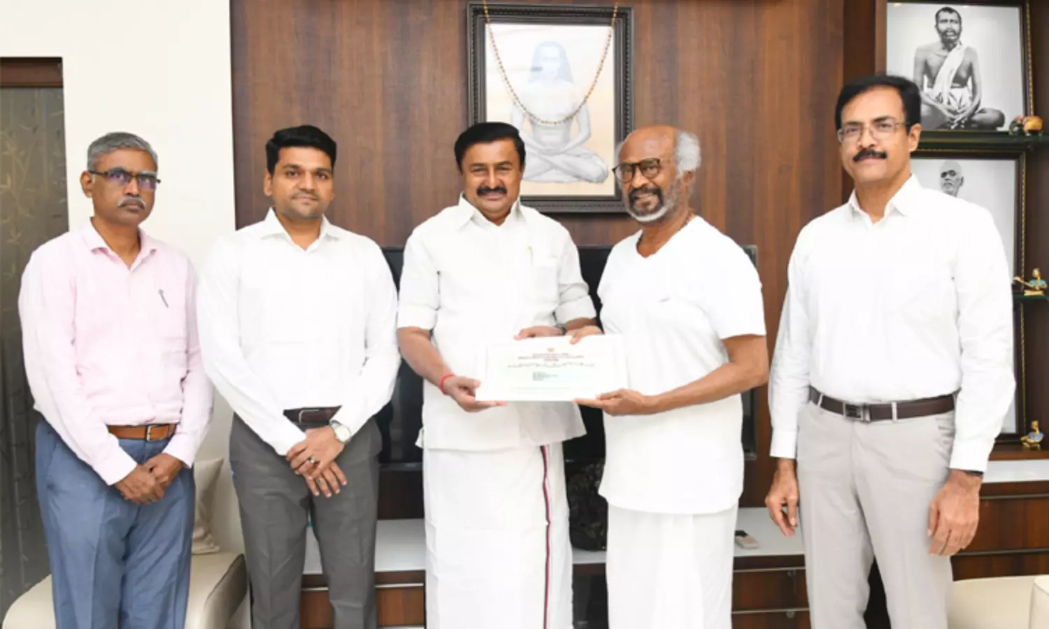 தமிழ்நாடு முதல்-அமைச்சர் மு.க.ஸ்டாலின் சார்பில் தமிழ் வளர்ச்சி மற்றும் செய்தித்துறை அமைச்சர் சாமிநாதன் இன்று சூப்பர் ஸ்டார் ரஜினிகாந்த் இல்லத்திற்கு நேரில் சென்று 13.9.2025 அன்று சென்னை நேரு உள்விளையாட்டு அரங்கத்தில் நடைபெறவுள்ள “சிம்பொனி சிகரம் தொட்ட தமிழன் இசைஞானி இளையராஜாவின் பொன்விழா ஆண்டு 50 பாராட்டு விழா”-விற்கான அழைப்பிதழை வழங்கினார். அப்போது முதல்-அமைச்சரின் செயலாளர் சண்முகம், தமிழ் வளர்ச்சி மற்றும் செய்தித்துறை செயலாளர் ராஜாராமன், செய்தி மக்கள் தொடர்புத் துறை இயக்குநர் வைத்திநாதன் ஆகியோர் உடனிருந்தனர்.
