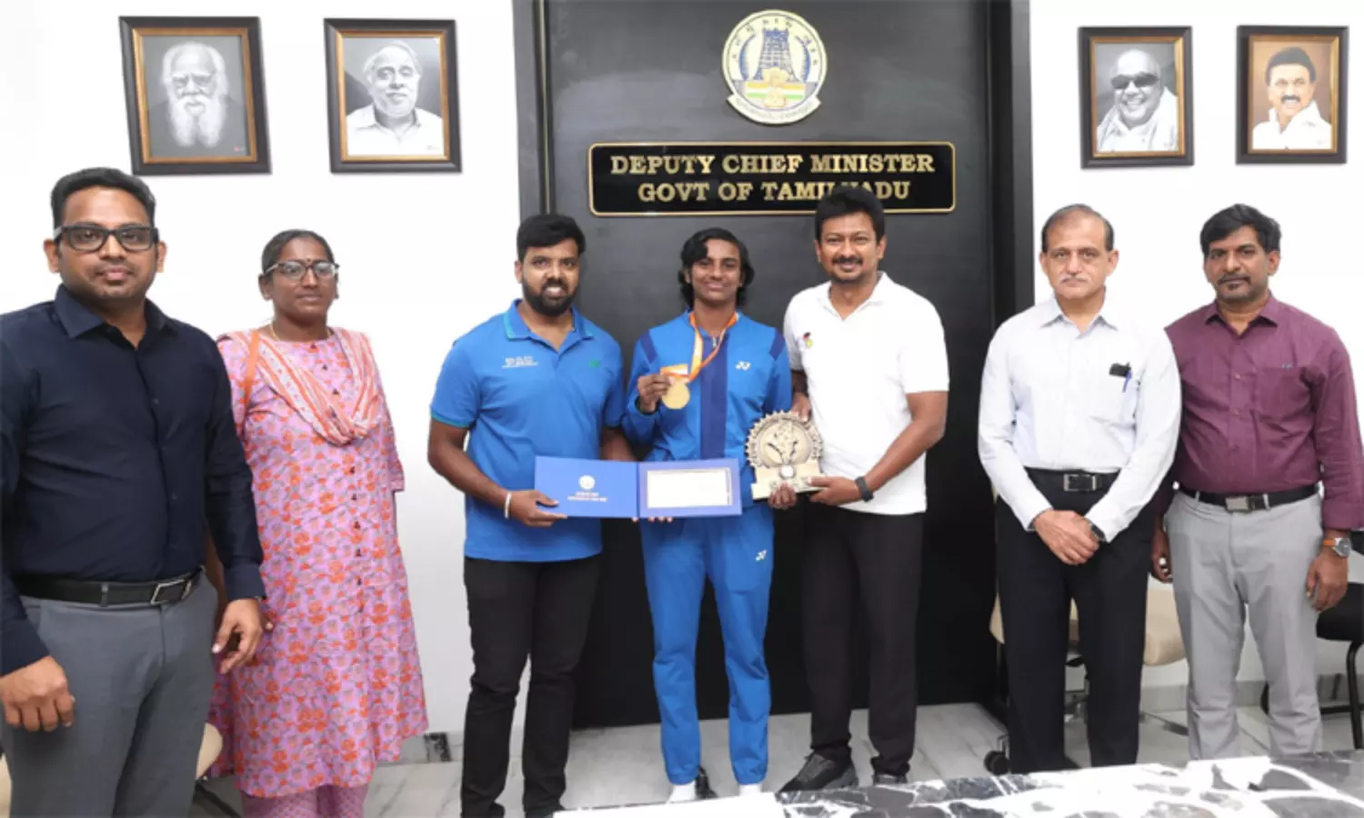 தமிழ்நாடு துணை முதல்-அமைச்சர் உதயநிதி ஸ்டாலின் சீனாவில் நடைபெற்ற பேட்மிண்டன் ஆசிய ஜூனியர் சாம்பியன்ஷிப் 2025 போட்டியில், இந்தியாவின் முதல் தங்கப் பதக்கத்தை வென்று வரலாற்று சாதனை படைத்துள்ள தமிழ்நாட்டின் வீராங்கனை எஸ்.ஆர். தீக்ஷாவுக்கு ரூ. 5 லட்சத்திற்கான ஊக்கத்தொகை காசோலையை வழங்கினார்.