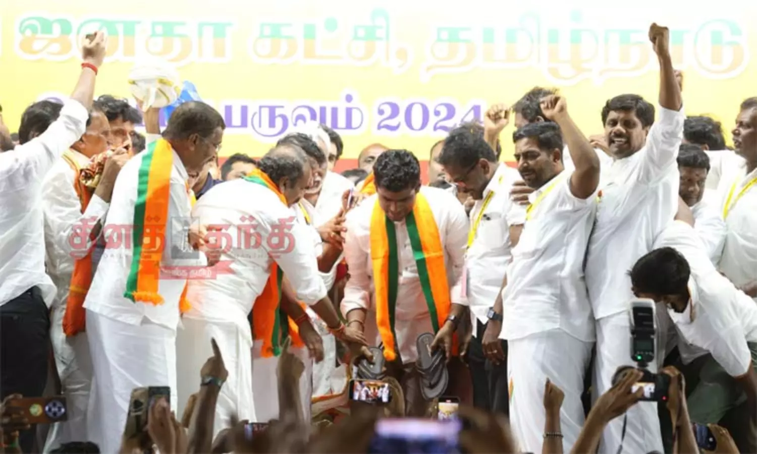 அண்ணாமலை காலில் அணிந்துகொள்ள செருப்பு வழங்கிய பா.ஜ.க. மாநில தலைவர் நயினார் நாகேந்திரன்