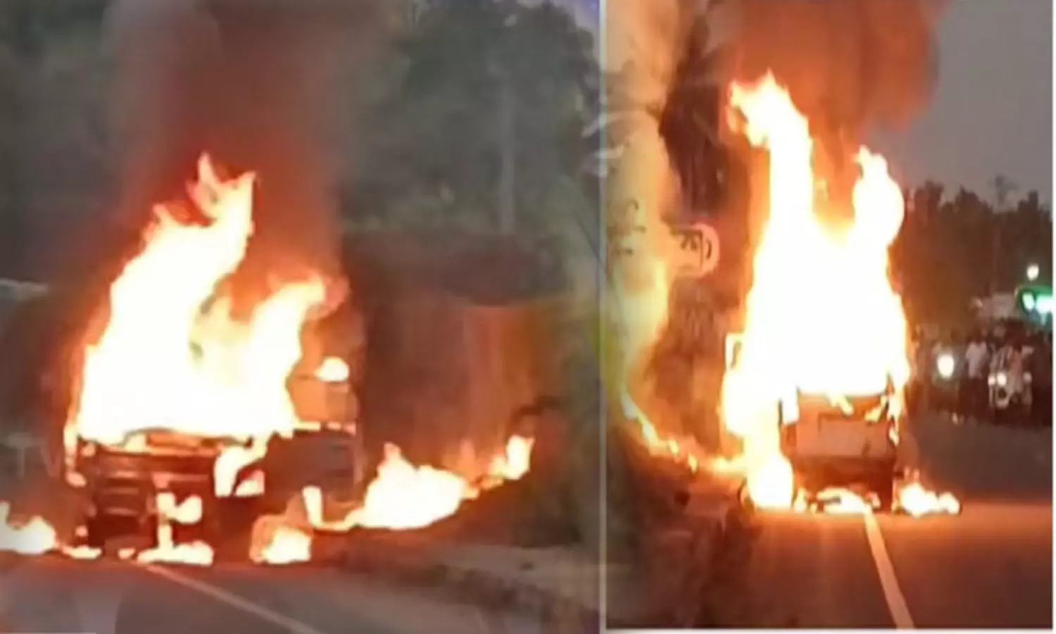 இந்த தீ விபத்தில் கார் முற்றிலும் எரிந்து சேதமடைந்தது. இந்த விபத்தால் காரில் இருந்த ஐயப்ப பக்தர்கள் பெரும் அதிர்ச்சியடைந்தனர். பின்னர் அங்கு வந்த போலீசார் விபத்து குறித்து விசாரணை நடத்தி வருகின்றனர்.