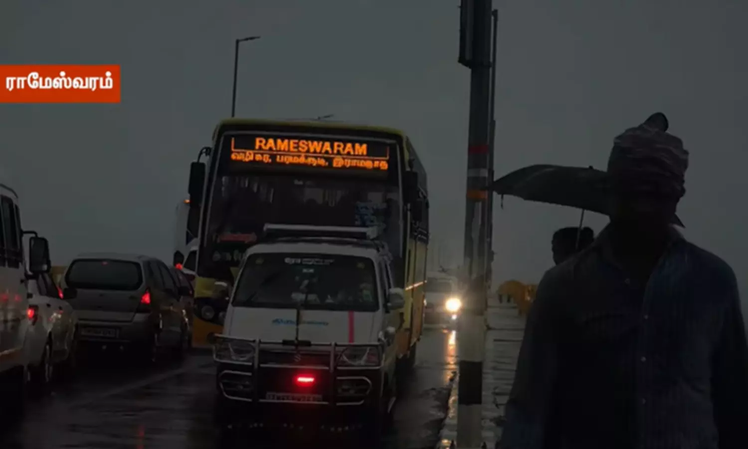 ராமேஸ்வரத்தில் தொடர் கனமழை; இருளில் மூழ்கிய பாம்பன் பாலம்