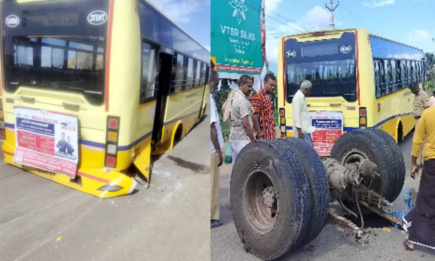இதனால் டிரைவரின் கட்டுப்பாட்டை இழந்த பஸ்சின் பின் பக்கத்தில் உள்ள 2 சக்கரங்களும் தனியாக கழன்று சாலையில் ஓடியது. எனவே பஸ்சின் பின்பக்கம் அமர்ந்திருந்த 3 மாணவர்கள் உள்பட பஸ்சில் இருந்த 40 பயணிகளும் பஸ்சின் உள்ளே தூக்கி வீசப்பட்டனர். இதில் பின்பகுதியில் இருந்த 3 மாணவர்கள் படுகாயம் அடைந்தனர்.