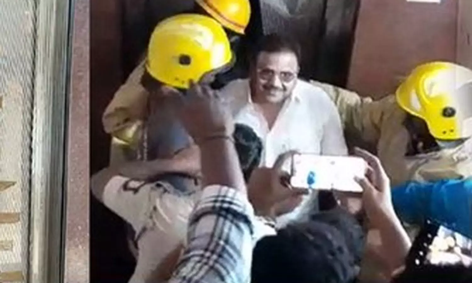 இதனால் விடுதி ஊழியர்களும், காங்கிரஸ் கட்சியினரும் அதிர்ச்சி அடைந்தனர். இதையடுத்து விடுதி ஊழியர்கள், அவசர கால சாவியை பயன்படுத்தி லிப்டை திறக்க முயற்சித்தனர். ஆனால் அது பயனளிக்காத நிலையில், தீயணைப்பு துறையினருக்கு இது குறித்து தகவல் தெரிவிக்கப்பட்டது.