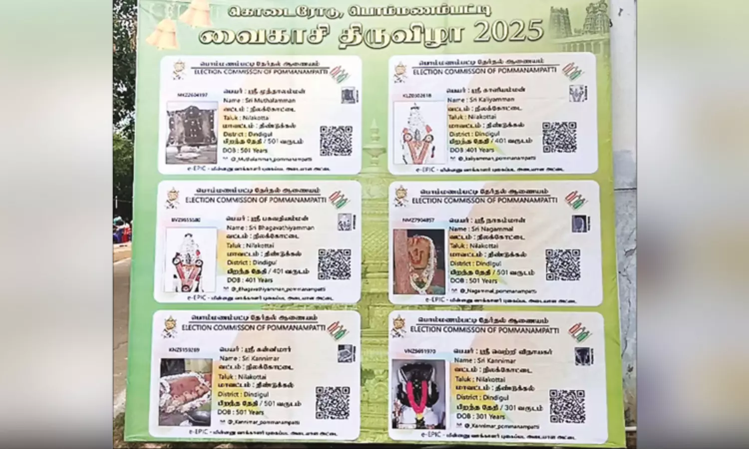 வாக்காளர் அடையாள அட்டை போல் பேனர் வைத்த பக்தர்கள்... கோவில் திருவிழாவில் வினோதம்