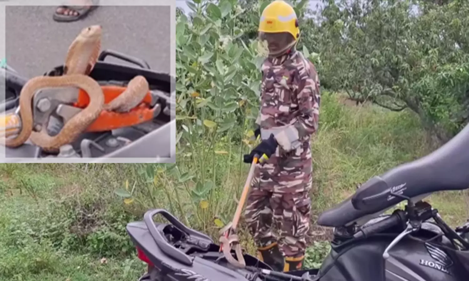 தகவலறிந்த தீயணைப்புத்துறையினர் சம்பவ இடத்திற்கு விரைந்தனர். பைக்கின் சீட்டை அப்புறப்படுத்திய தீயணைப்புத்துறையினர் சில நிமிடங்கள் போராடி பாம்பை பத்திரமாக பிடித்தனர்.