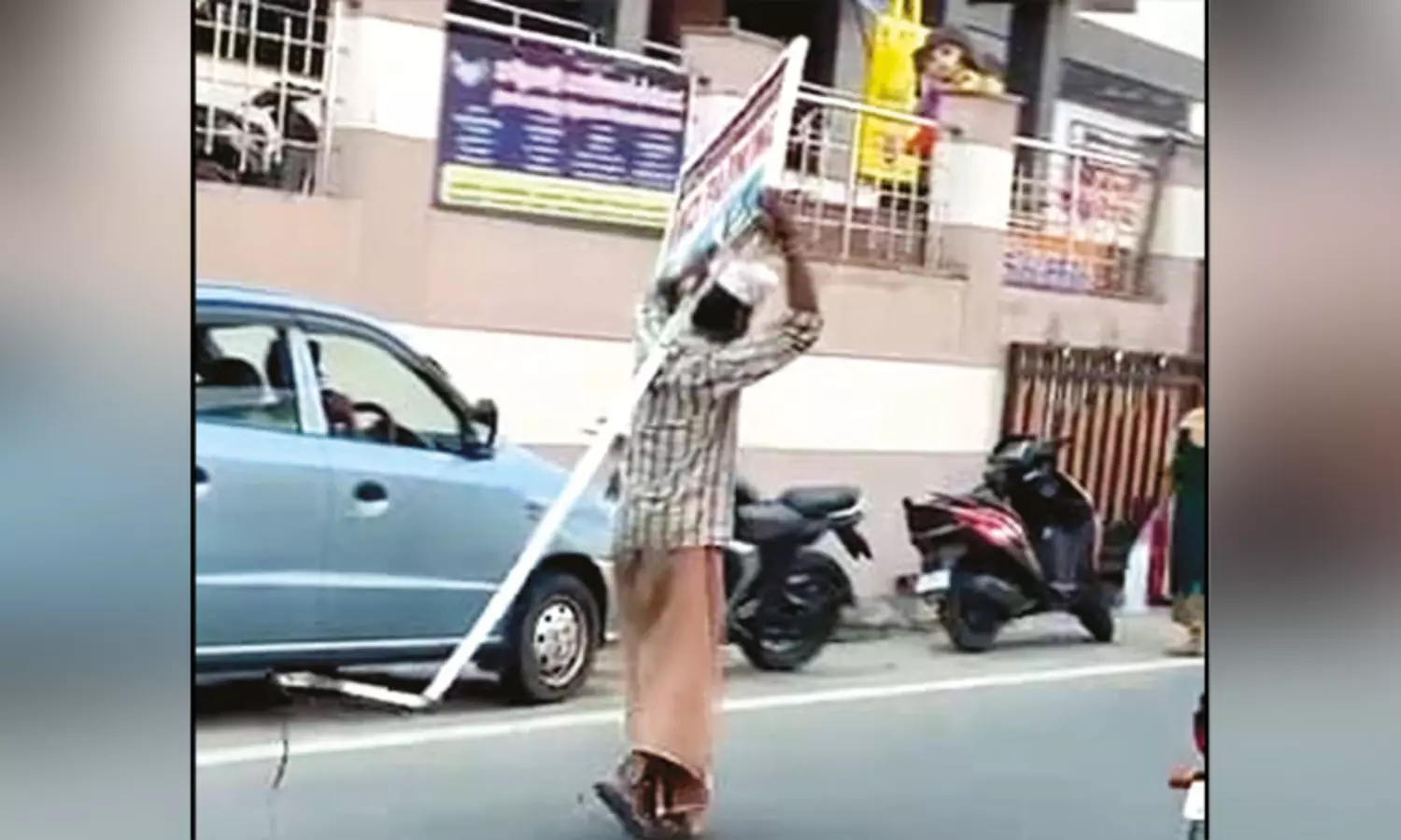 குடிபோதையில் 'நோ பார்க்கிங்' பலகையை தூக்கி சென்ற மதுபிரியர்