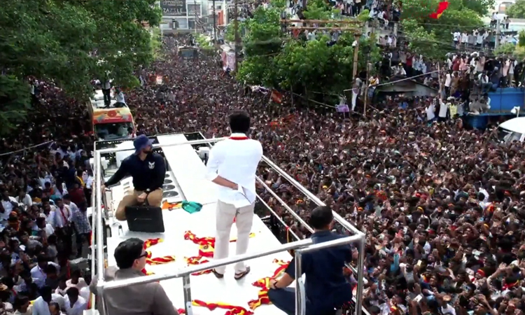 விக்கிரவாண்டி, மதுரை மாநாட்டினை தொடர்ந்து, திருச்சியில் தமிழக வெற்றிக் கழகத் தலைவர் விஜய் இன்று பிரசாரத்தை தொடங்கியுள்ளார். காந்தி மார்க்கெட் மரக்கடை அருகே உள்ள எம்.ஜி.ஆர். சிலை முன்பு வாகனத்தின் மேல் நின்றபடி விஜய் தொண்டர்கள் மத்தியில் பேசினார். அப்போது அவர் கூறியதாவது:-