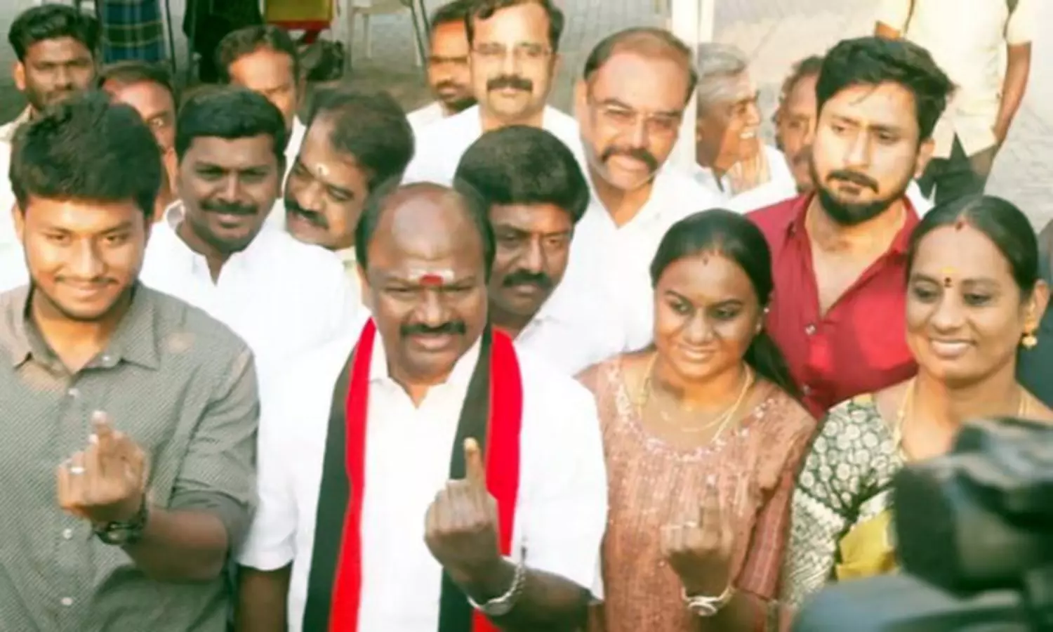 ஈரோடு இடைத்தேர்தல்: குடும்பத்தினருடன் வாக்கு செலுத்திய திமுக வேட்பாளர் வி.சி. சந்திரகுமார்