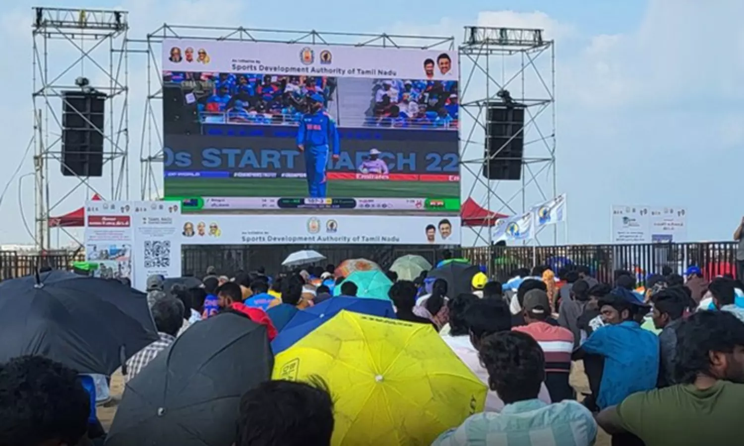 இந்நிலையில், தமிழ்நாடு விளையாட்டு மேம்பாட்டு ஆணையம் சார்பில், சாம்பியன்ஸ் டிராபி தொடரின் இறுதிப்போட்டியை சென்னையில் இரண்டு இடங்களில் திரையிட்டுள்ளது. இந்தப் போட்டி மெரினா கடற்கரை (விவேகானந்தா மாளிகைக்கு எதிரே) மற்றும் பெசன்ட் நகர் கடற்கரை (போலீஸ் பூத் அருகில்) ஆகிய இடங்களில் திரையிடப்பட்டுள்ளது. அதன்படி, சென்னை பெசன்ட் நகர் கடற்கரை மற்றும் மெரினா கடற்கரையில் திரையிடப்பட்டுள்ள இந்தியா - நியூசிலாந்து அணிகளுக்கு இடையேயான சாம்பியன்ஸ் டிராபி இறுதிப் போட்டியை ரசிகர்கள் தங்களது நண்பர்கள், குடும்பத்தினருடன் வெயிலையும் பொருட்படுத்தாமல் கண்டு ரசித்து வருகின்றனர். நேரம் செல்லச்செல்ல போட்டியை பார்ப்பதற்காக வரும் ரசிகர்களின் எண்ணிக்கை அதிகரித்து வருகிறது.
