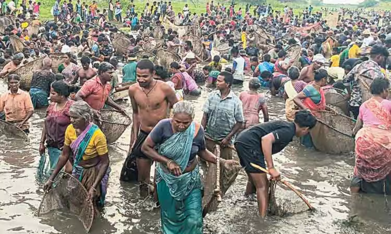 இருபதுக்கும் மேற்பட்ட கிராமங்களில் இருந்து திரளான பொதுமக்கள் காலை முதலே மீன்பிடி வலைகளுடன் குவிந்தனர்.;