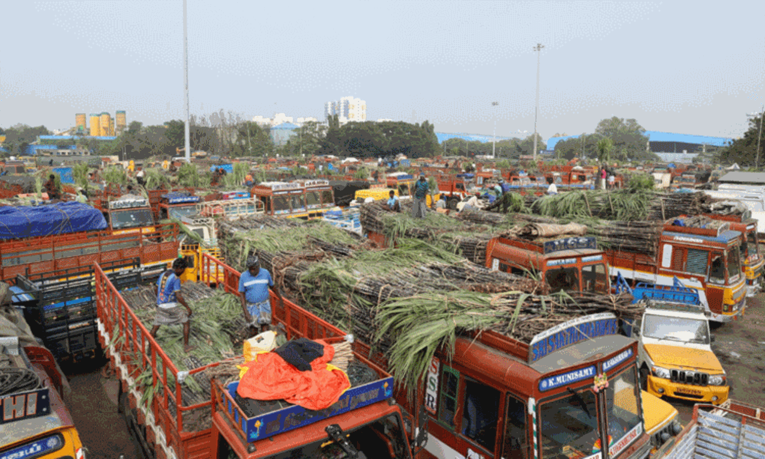 தொடர்ந்து மேலும் பல லாரிகளில் கரும்புகள் வந்த வண்ணம் உள்ளன. 20 கரும்புகள் கொண்ட ஒரு கட்டு, கரும்பின் தரத்தைப் பொறுத்து ரூ.300 முதல் ரூ.600 வரை விற்பனை செய்யப்படுகிறது. ஒருசிலர் ஒரு கட்டு ரூ.800 வரையிலும் விற்பனை செய்தனர். அதேபோல, மஞ்சள் குலை விற்பனையும் அமோகமாக நடைபெற்று வருகிறது.