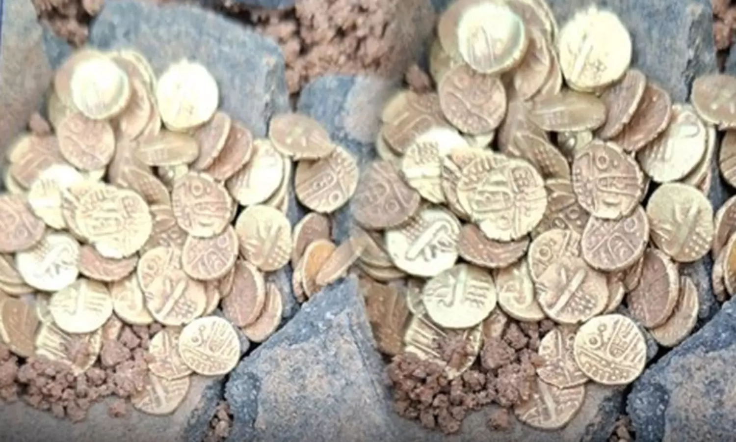 சில அடி தூரம் பள்ளம் தோண்டப்பட்டபோது, அதில் புதையல் ஒன்று இருந்ததை தொழிலாளர்கள் கண்டுபிடித்தனர். இதையடுத்து, அந்த புதையலை மீட்டு பார்த்தபோது 100-க்கும் மேற்பட்ட தங்கக்காசுகள் அதில் இருந்ததுள்ளது. இதையடுத்து கோவில் கருவறையில் கண்டெடுக்கப்பட்ட தங்கக்காசு அரசு அதிகாரிகளிடம் ஒப்படைக்கப்பட்டது. தங்கக்காசுகளை ஆராய்ந்து வருவதாக அதிகாரிகள் தெரிவித்தனர்.