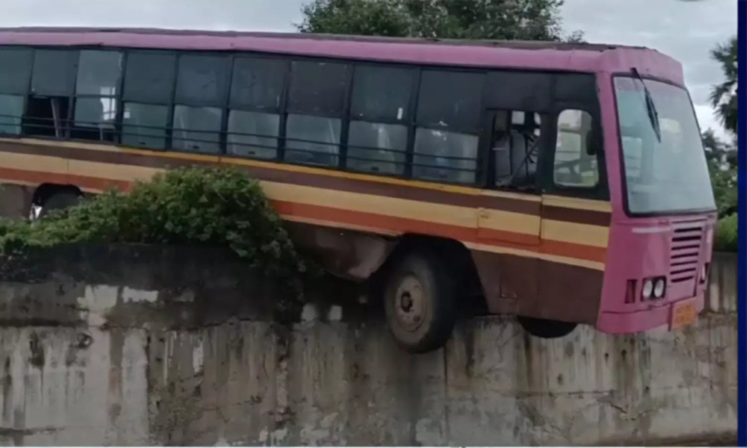 ஏரிக்கரை தடுப்புச் சுவற்றில் மோதி அரசுப் பேருந்து அந்தரத்தில் தொங்கிய சம்பவம் பரபரப்பை ஏற்படுத்தியுள்ளது.;