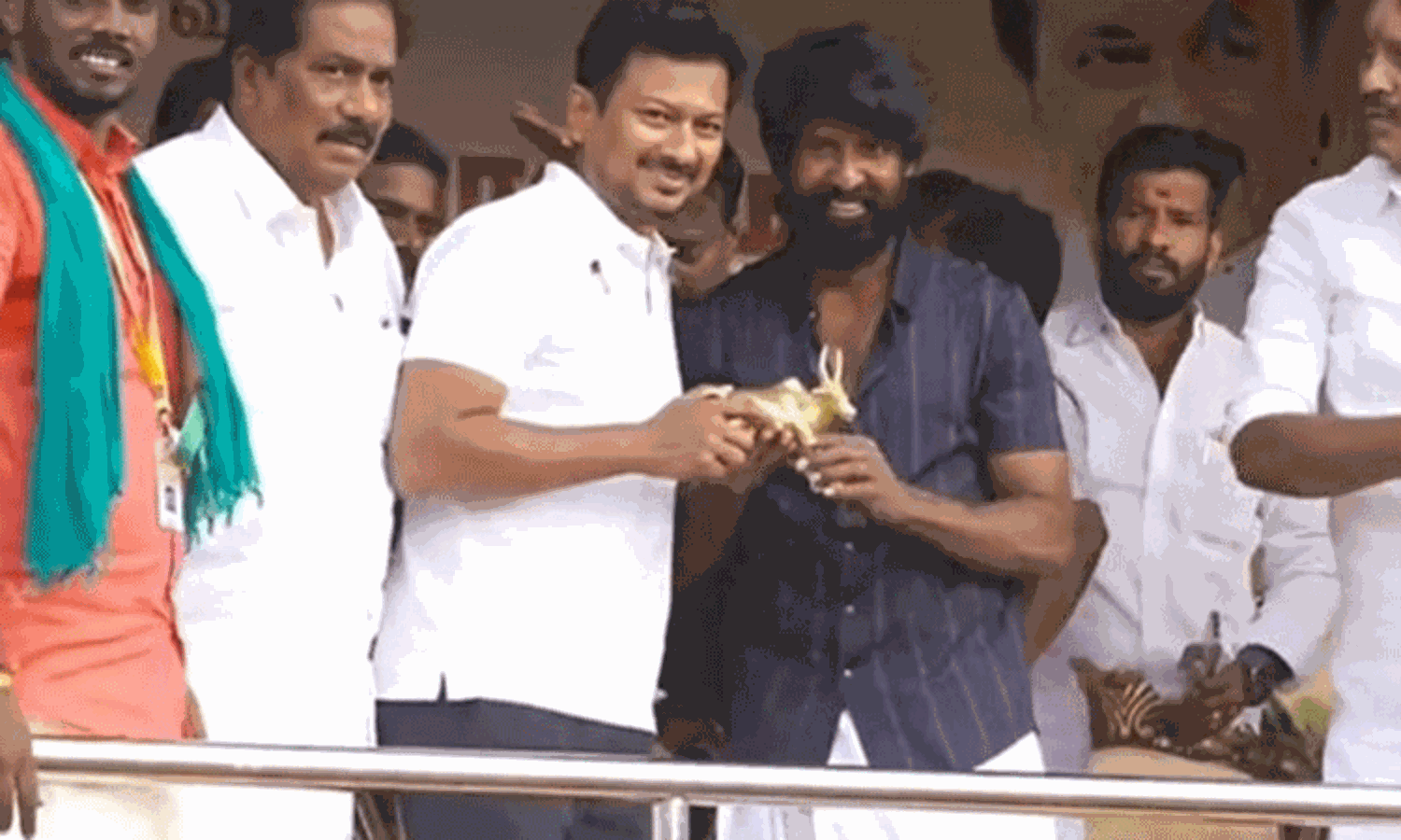 மதுரை பாலமேட்டில் உலக புகழ்பெற்ற ஜல்லிக்கட்டு போட்டி விறுவிறுப்பாக நடைபெற்று வருகிறது. ஜல்லிக்கட்டு போட்டியை துணை முதல்-அமைச்சர் உதயநிதி ஸ்டாலின் கொடியசைத்து தொடங்கி வைத்தார். அப்போது போட்டியை கண்டுகளிப்பதற்காக நடிகர் சூரி, ஜல்லிக்கட்டு அரங்கத்துக்கு வருகை தந்தார். அப்போது சிறப்பு விருந்தினராக வருகை தந்து போட்டியை தொடங்கி வைத்த துணை முதல்-அமைச்சர் உதயநிதி ஸ்டாலினுக்கு காளை சிற்பத்தை நினைவுப்பரிசாக சூரி வழங்கினார்.