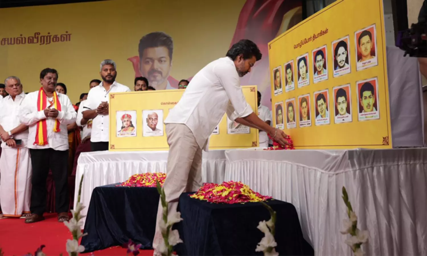 இந்தி திணிப்பை எதிர்த்து போராடி உயிர் ஈந்தவர்களை நினைவுகூறும் வகையில் ஒவ்வொரு ஆண்டும் ஜனவரி 25-ம் தேதி மொழிப்போர் தியாகிகள் நினைவு நாள் அனுசரிக்கப்படுகிறது. இதை முன்னிட்டு செயல் வீரர்கள் கூட்டத்தில் மேடையில் வைக்கப்பட்டுள்ள மொழிப்போர் தியாகிகளின் உருவப் படங்களுக்கு விஜய் மலர் தூவி மரியாதை செலுத்தினார். மேலும் தவெக கொள்கைத் தலைவர்களின் படங்களுக்கும் அவர் மலர் தூவி மரியாதை செலுத்தினார்.