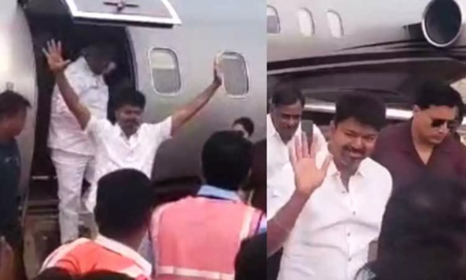 மதுரை: விமானத்தில் இருந்து உற்சாகத்துடன் குதித்து இறங்கிய விஜய்...வீடியோ வைரல்