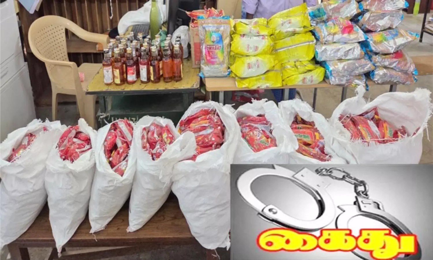 தூத்துக்குடி மாவட்ட எஸ்.பி. ஆல்பர்ட் ஜான் உத்தரவின்படி, தூத்துக்குடி ஊரக உட்கோட்ட டி.எஸ்.பி. சுதீர் மேற்பார்வையில் சிப்காட் இன்ஸ்பெக்டர் சைரஸ் தலைமையில் எஸ்.ஐ. சுப்புராஜ் மற்றும் போலீசார் நேற்று (29.03.2025) ரோந்து பணியில் ஈடுபட்டனர். அப்போது தூத்துக்குடியில் மடத்தூர், தெற்கு தெருவில் சந்தேகப்படும்படி நின்று கொண்டிருந்தவரை பிடித்து விசாரணை செய்தனர். அதில் அவர் அதே பகுதியைச் சேர்ந்த மாடதங்கம் மகன் ராஜவேல் (வயது 54) என்பதும், அவரது வீட்டில் சட்டவிரோத விற்பனைக்காக தடை செய்யப்பட்ட புகையிலை பொருட்கள் மற்றும் மதுபான பாட்டில்களை பதுக்கி வைத்திருந்ததும் விசாரணையில் தெரியவந்தது.