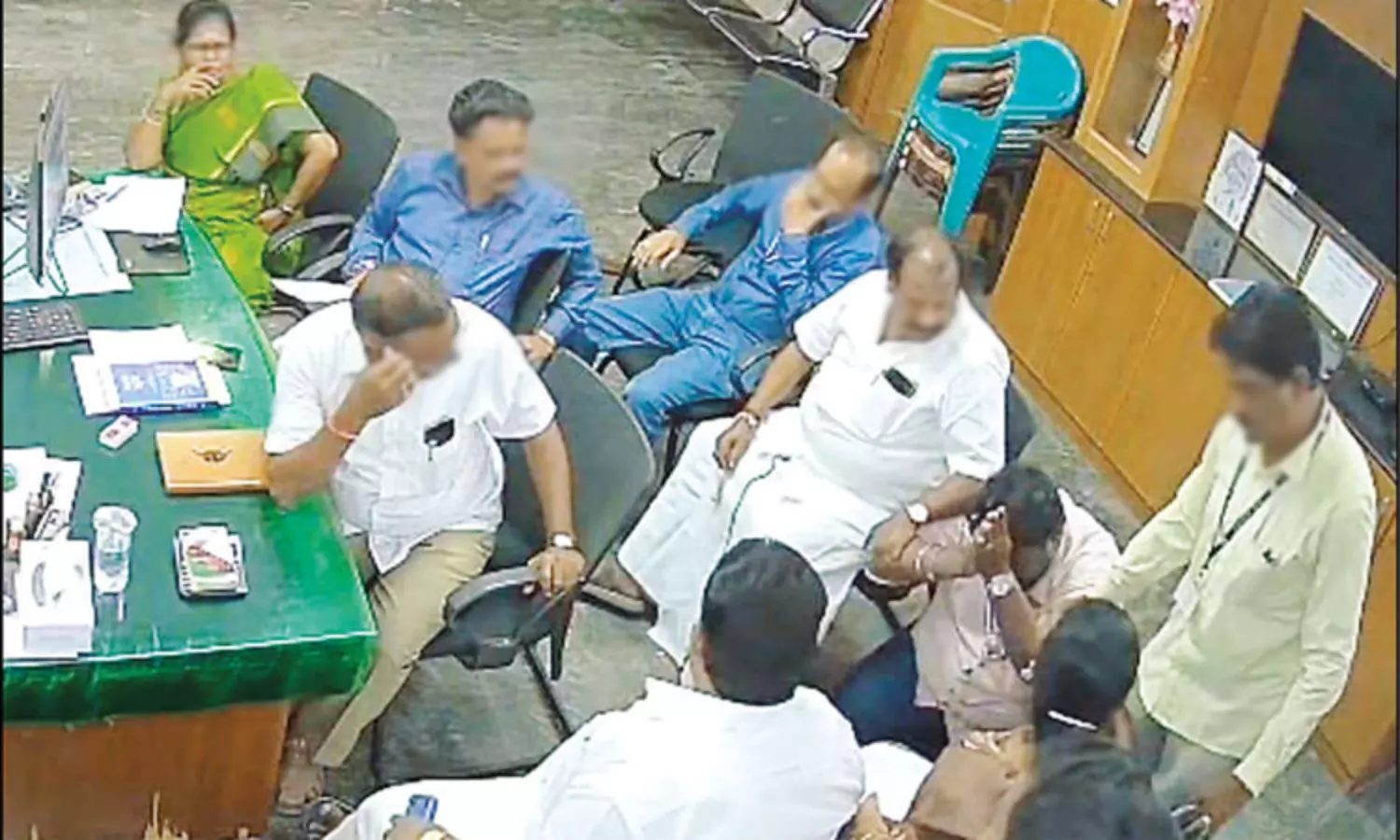 விழுப்புரம் மாவட்டம் திண்டிவனம் ரோஷணை காலனி பகுதியை சேர்ந்தவர் சிவலிங்கம் மகன் முனியப்பன் (வயது 36). இவர் திண்டிவனம் நகராட்சி அலுவலகத்தில் இளநிலை உதவியாளராக பணிபுரிந்து வருகிறார். இந்த நிலையில், கடந்த 29-ந்தேதி நகராட்சி அலுவலகத்தில் ஆணையர் அறையில் இருந்த கண்காணிப்பு கேமராவில் பதிவான காட்சி நேற்று முன்தினம் இரவு வெளியானது. அந்த காட்சியில் ஆணையர் அறையில் நகராட்சி அலுவலர்கள் மற்றும் தி.மு.க. கவுன்சிலர் ரம்யா உள்பட பலர் இருந்தனர். அப்போது, இளநிலை உதவியாளர் முனியப்பன் திடீரென, கவுன்சிலர் ரம்யாவின் அருகே சென்று அவரது காலில் விழுந்தார்.