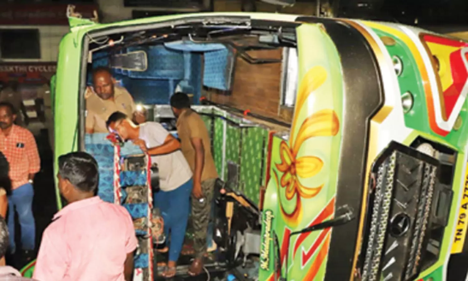 திடீரென டிரைவரின் கட்டுப்பாட்டை இழந்து சாலையின் குறுக்கே உள்ள சென்டர் மீடியனில் இடித்து கவிழ்ந்தது.;