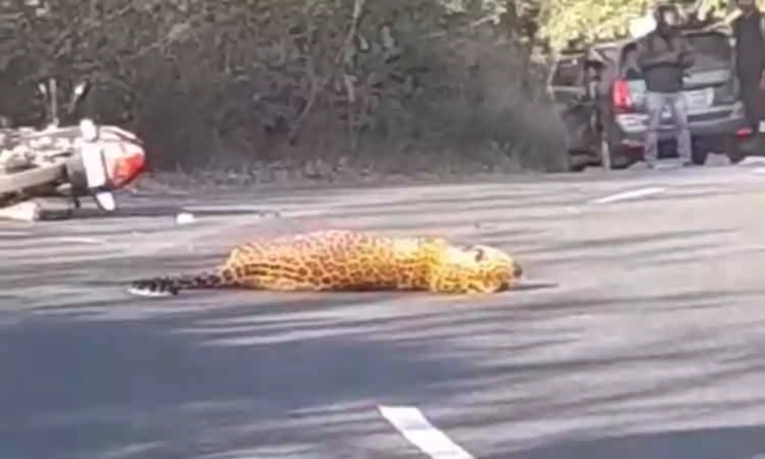 சாலையைக் கடக்க முயன்ற சிறுத்தை புலி மோட்டார் சைக்கிளில் அடிபட்டு காயத்துடன் உயிர் தப்பியது.;