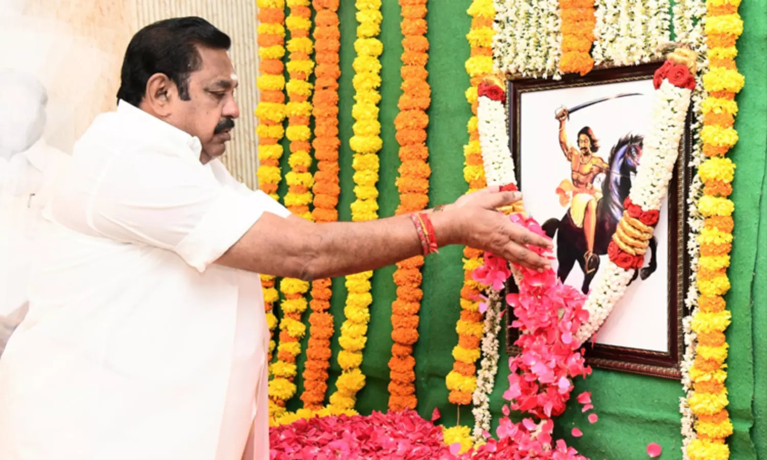 ஒண்டி வீரன் உருவப் படத்திற்கு, அதிமுக பொதுச்செயலாளர் எடப்பாடி பழனிசாமி மரியாதை செலுத்தினார்.;