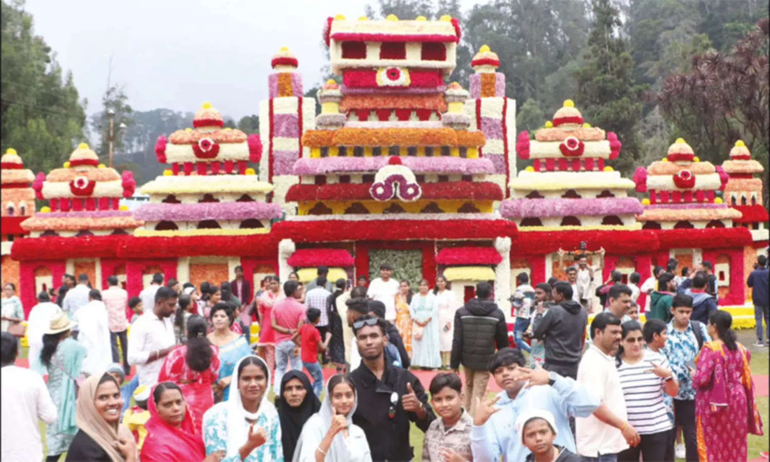 ரோஜா, சாமந்தி, கார்னேசன் போன்ற 2 லட்சம் மலர்கள் மூலம் 75 அடி நீளம், 25 அடி உயரத்தில் பண்டைய அரசர் கால அரண்மனை அமைப்பும் பிரமிப்பூட்டும் வகையில் அமைக்கப்பட்டுள்ளது. 8 அடி உயரம், 35 அடி நீளத்தில் 50 ஆயிரத்து 400 சாமந்தி மலர்கள் மூலம் அன்னபட்சி, 4 ஆயிரம் மலர்த்தொட்டிகள், 35 ஆயிரம் சாமந்தி, ரோஜா பூக்கள் மூலம் கல்லணை காட்சிப்படுத்தப்பட்டுள்ளது.