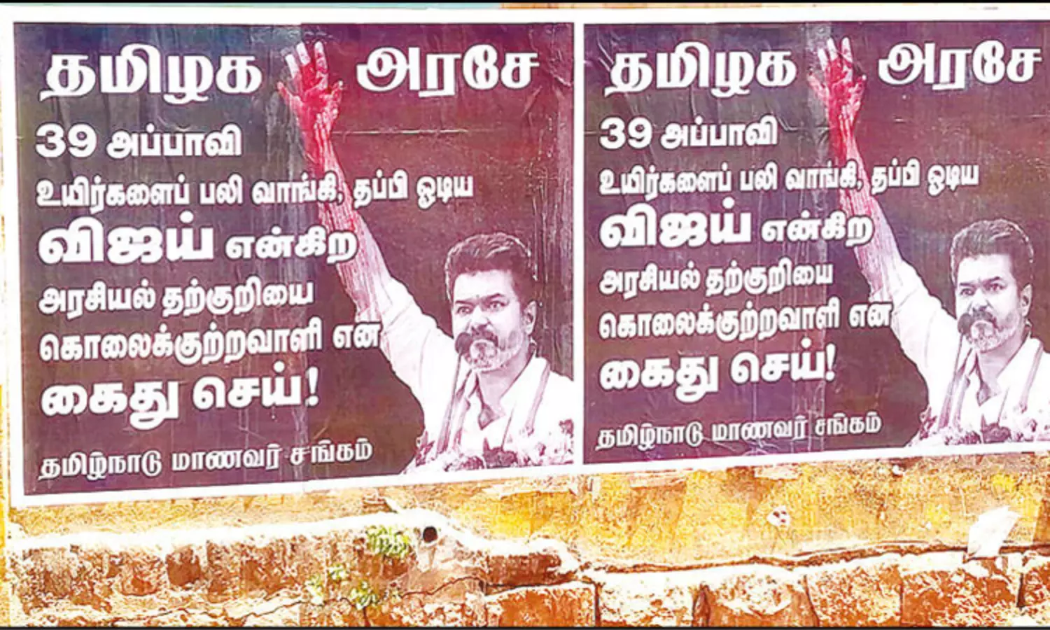 இந்நிலையில் தவெக தலைவர் விஜய்யை கைது செய்ய வலியுறுத்தி கரூர் மற்றும் திருச்சியில் பல்வேறு பகுதிகளில் தமிழ்நாடு மாணவர் சங்கம் என்ற பெயரில் சுவரொட்டிகள் ஒட்டப்பட்டுள்ளன. இந்த சுவரொட்டி நகர் முழுவதும் பல இடங்களிலும் ஒட்டப்பட்டிருப்பது பரபரப்பை ஏற்படுத்தியுள்ளது.