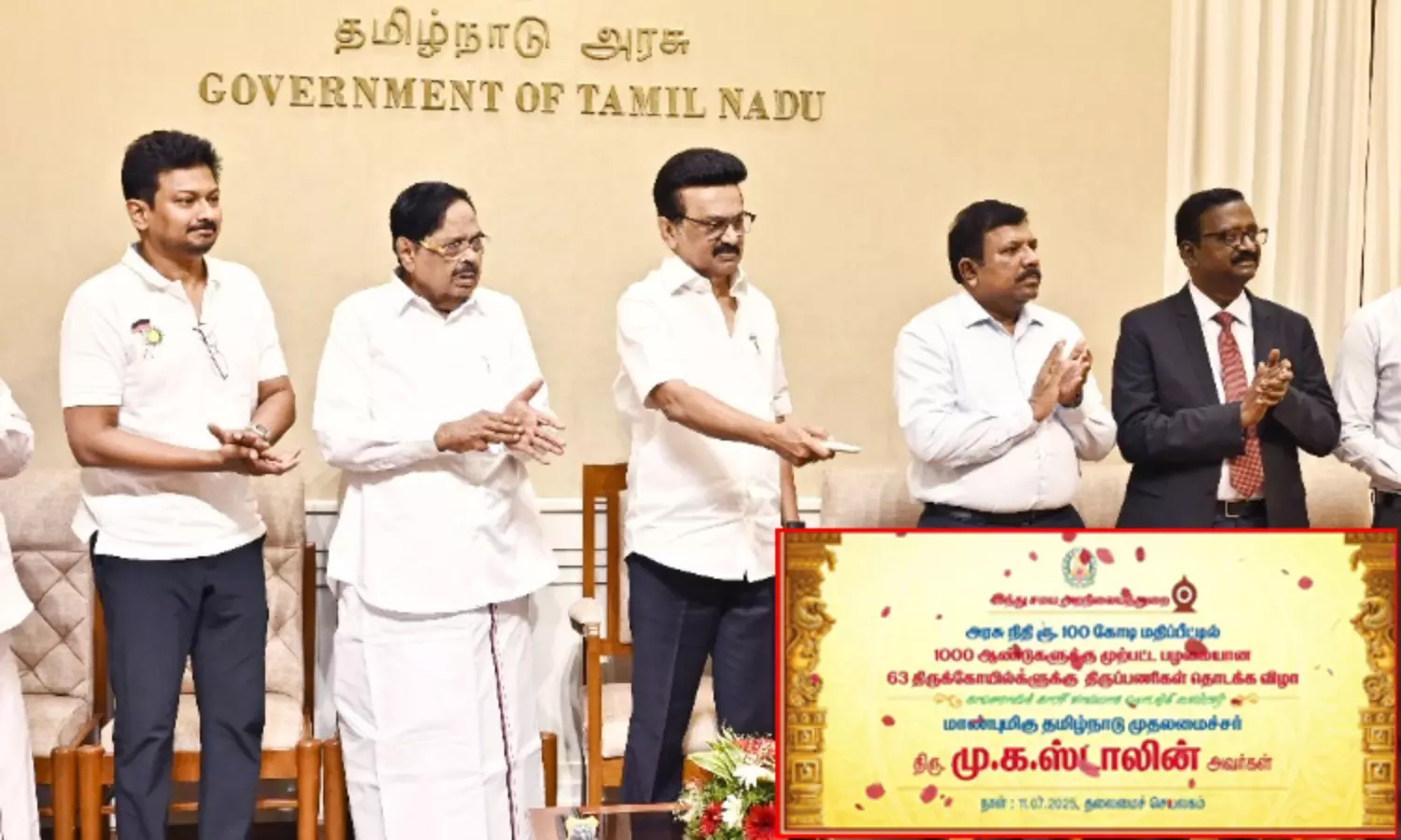 தமிழ்நாடு முதல்-அமைச்சர் மு.க.ஸ்டாலின் இன்று (11.07.2025) தலைமைச் செயலகத்தில், இந்து சமய அறநிலையத்துறை சார்பில் ரூ.100 கோடி மதிப்பீட்டில் ஆயிரம் ஆண்டுகளுக்கு முற்பட்ட 63 கோவில்களை அதன் பழமை மாறாமல் புனரமைக்கும் வகையிலான பணிகளை காணொலிக் காட்சி வாயிலாக தொடங்கி வைத்தார்.