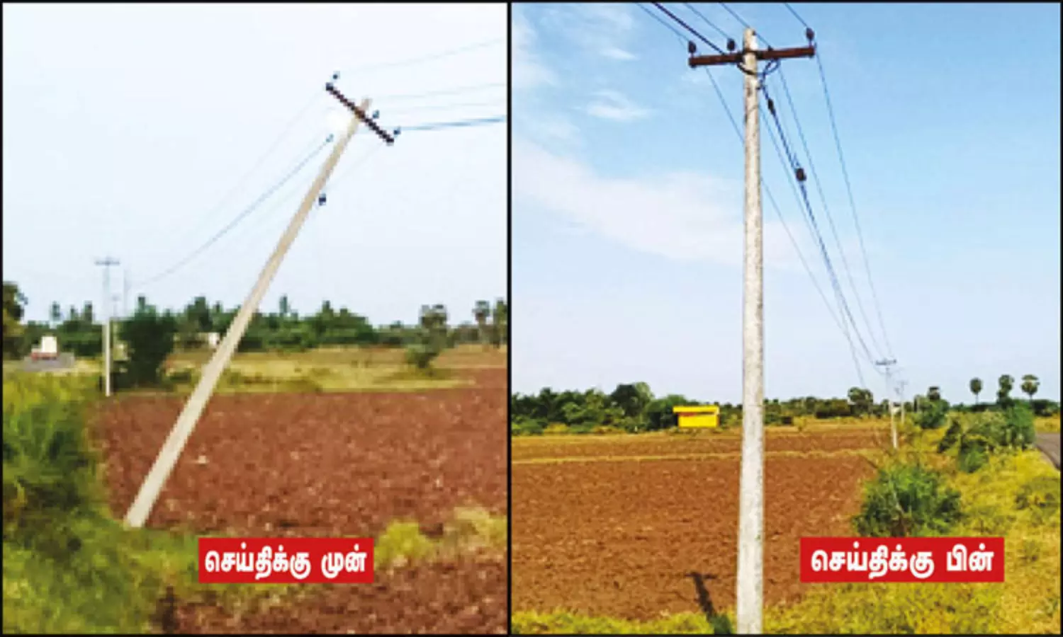 இது குறித்த செய்தி 'தினத்தந்தி' நாளிதழில் வெளியானது. இதைத்தொடர்ந்து பள்ளன்கோவில் மின்வாரிய அதிகாரிகள் மற்றும் ஊழியர்கள் சம்பவ இடத்தை நேரில் பார்வையிட்டு மின்கம்பத்தை சரி செய்தனர். இதனால் அந்த பகுதி விவசாயிகளும் பொதுமக்களும் மகிழ்ச்சி அடைந்தனர்.
