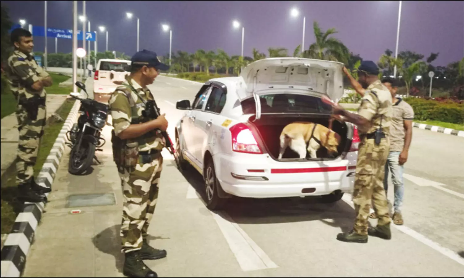 2-வது கட்டமாக விமான நிலைய வாகன நிறுத்தம் பகுதியில் மத்திய தொழில் பாதுகாப்பு படையினர் சோதனையில் ஈடுப்பட்டு வருகிறார்கள். 3-வது கட்டமாக விமான நிலையத்தில் முனைய நுழைவு வாயிலில் மோப்பநாய் உதவியுடன் பயணிகள் சோதனைக்கு உட்படுத்தப்பட்டுள்ளனர். 4-வது கட்டமாக பயணிகளின் உடைமைகள் ஸ்கேனர் கருவி மூலம் சோதனைக்கு உட்படுத்தப்பட்டு வருகிறது.