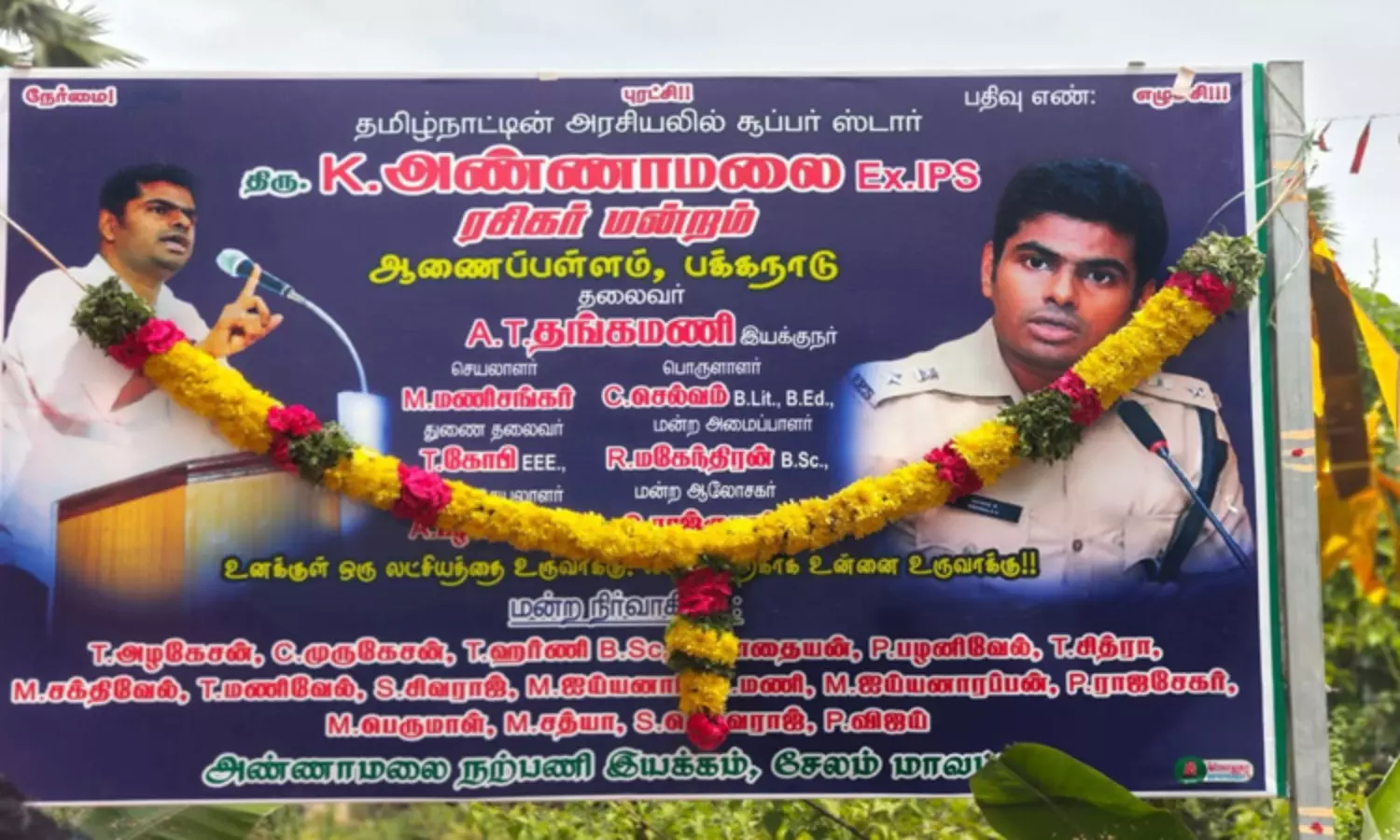 ஆணைப்பள்ளம், பக்கநாடு பகுதியில் உள்ள அண்ணாமலை ரசிகர் மன்ற பதாகையின் மேல்புறம், "நேர்மை, புரட்சி, எழுச்சி" ஆகிய வாசகங்கள் இடம்பெற்றுள்ளது.;