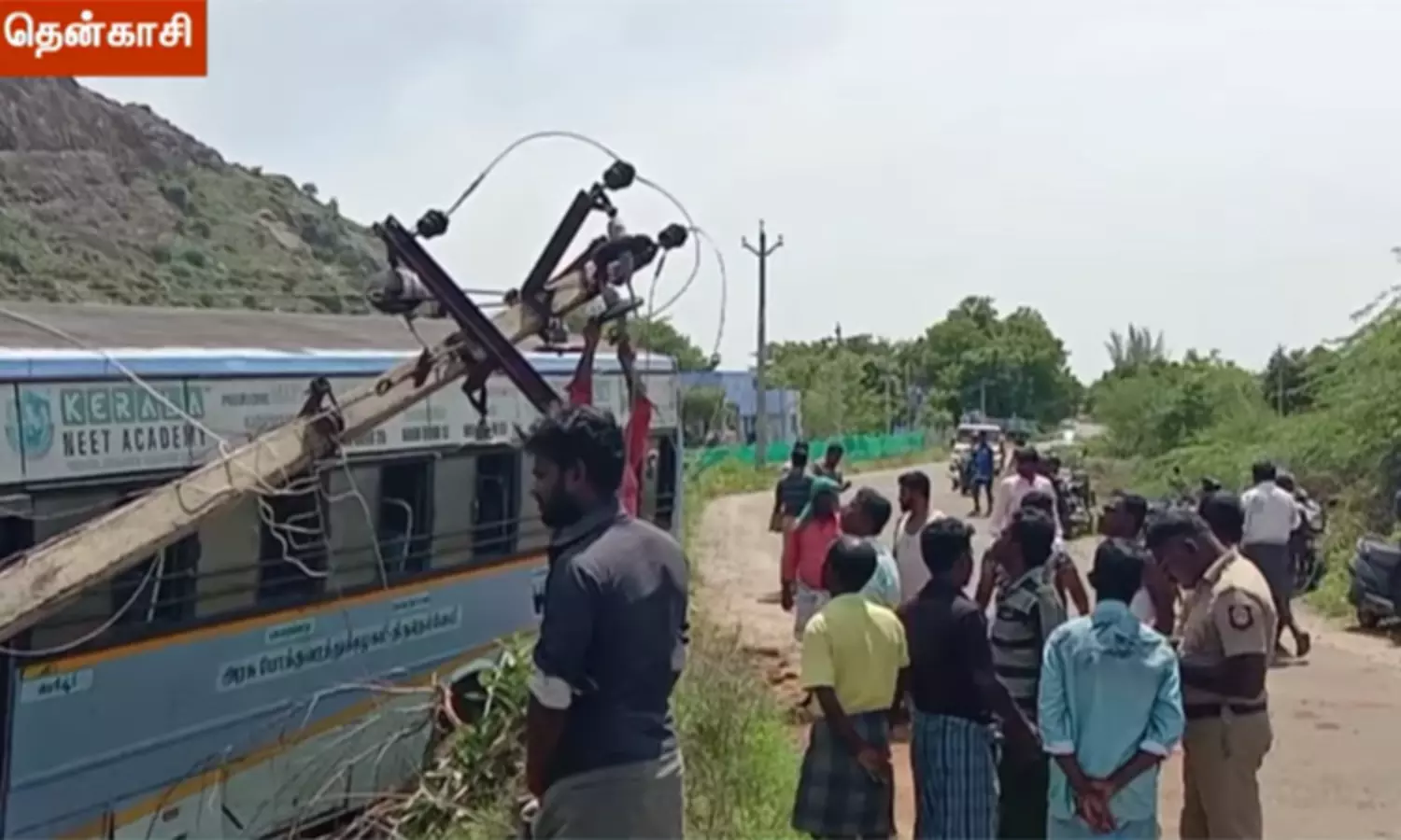 தென்காசி மாவட்டம் சங்கரன்கோவில்-வாசுதேவநல்லூர் சாலையில் அரசு பேருந்து ஒன்று சுமார் 30-க்கும் மேற்பட்ட பயணிகளுடன் சென்று கொண்டிருந்தது. அந்த பேருந்து கண்டிகைப்பேரி அருகே வந்தபோது திடீரென ஓட்டுநரின் கட்டுப்பாட்டை இழந்து சாலையோரம் இருந்த மின்கம்பத்தில் மோதி விபத்திற்குள்ளானது.