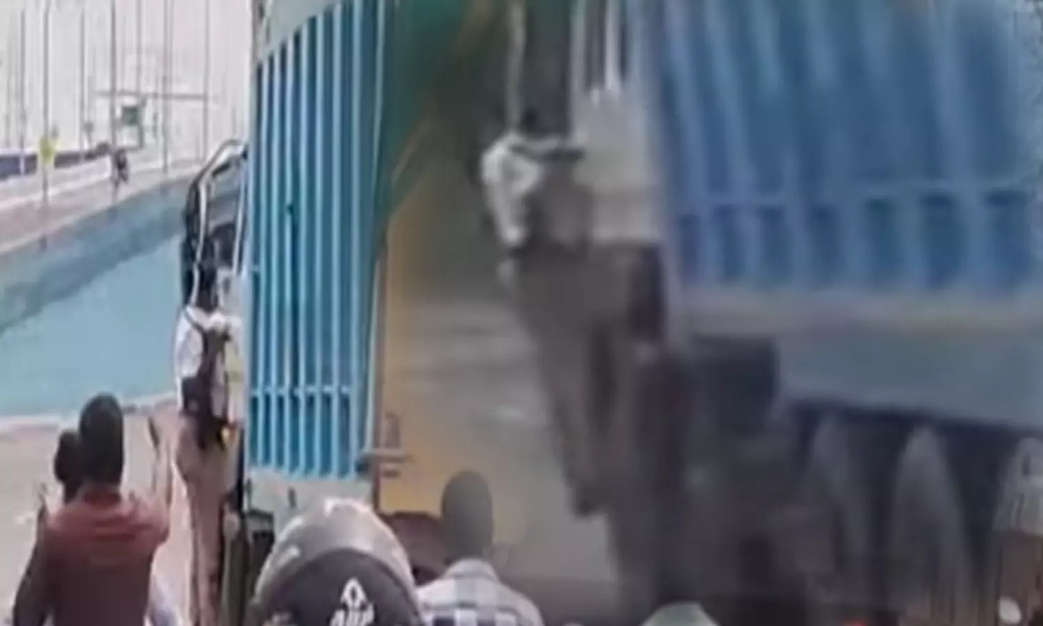 10 கிலோமீட்டர் தூரத்திற்கு லாரியில் காவலர் தொங்கிச் சென்ற வீடியோ காட்சி இணையத்தில் வைரலாகி வருகிறது.;