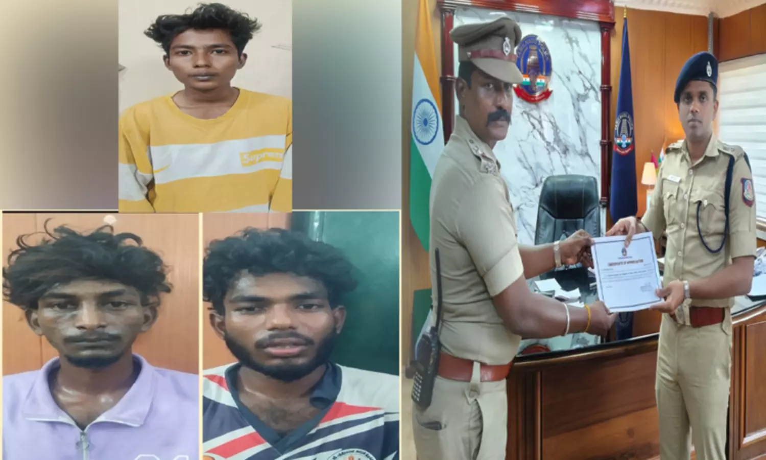 மேற்சொன்ன சம்பவ இடத்திற்கு விரைந்து சென்று குற்றவாளிகளை துரத்தி பிடித்து கைது செய்து சிறப்பாக பணிபுரிந்த சிப்காட் காவல் நிலைய போலீசாரை மாவட்ட எஸ்.பி. ஆல்பர்ட் ஜான் நற்பணி சான்றிதழ் வழங்கி பாராட்டினார்.