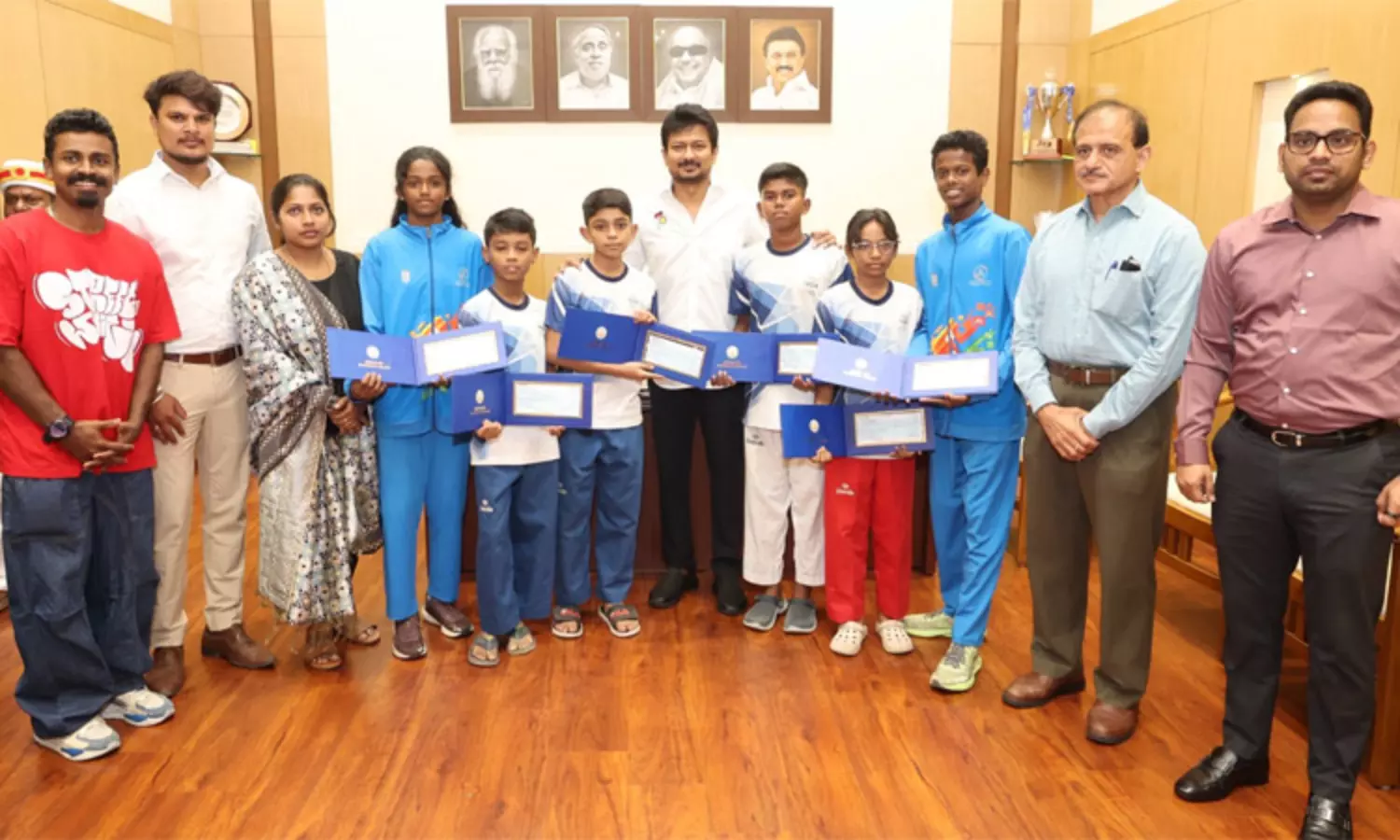 செர்பியா நாட்டில் நடைபெற உள்ள சர்வதேச பள்ளி விளையாட்டு கூட்டமைப்பு நடத்தும் ஜிம்னாசியாட் 2025 போட்டியில் பங்கேற்கவுள்ள தமிழ்நாட்டைச் சேர்ந்த ஆறு விளையாட்டு வீரர், வீராங்கனைகளுக்கு செலவீன தொகையாக மொத்தம் ரூ.15 லட்சத்திற்கான காசோலையினை தமிழ்நாடு துணை முதல் அமைச்சர் உதயநிதி ஸ்டாலின் வழங்கினார்.