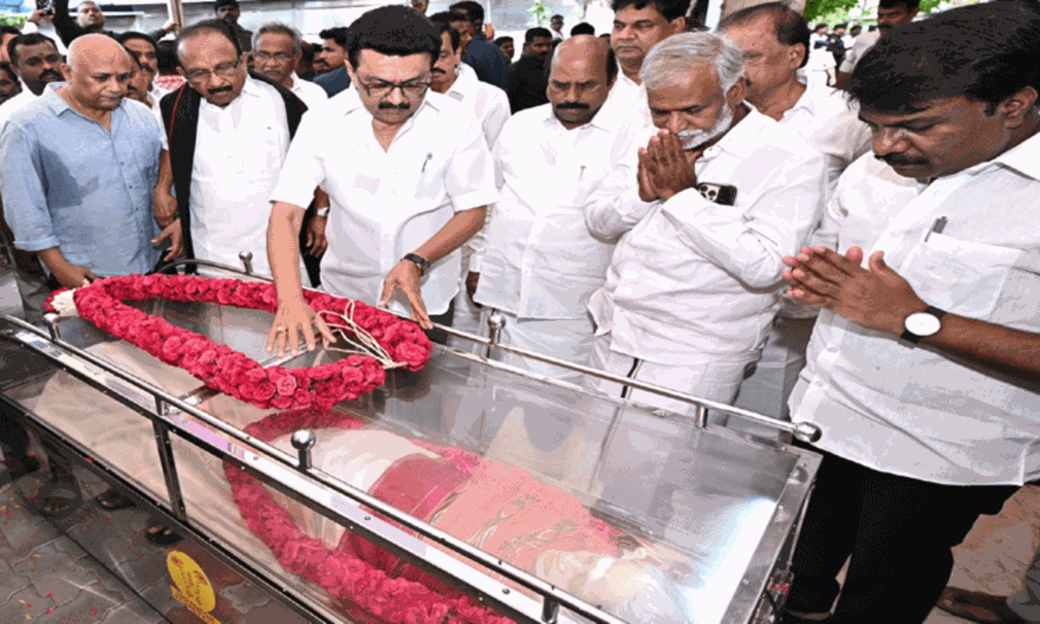 சரோஜா அம்மையாரின் இல்லத்திற்கு நேரில் சென்ற முதல்-அமைச்சர், அவரது உடலுக்கு மலர்மாலை வைத்து அஞ்சலி செலுத்தினார்.;